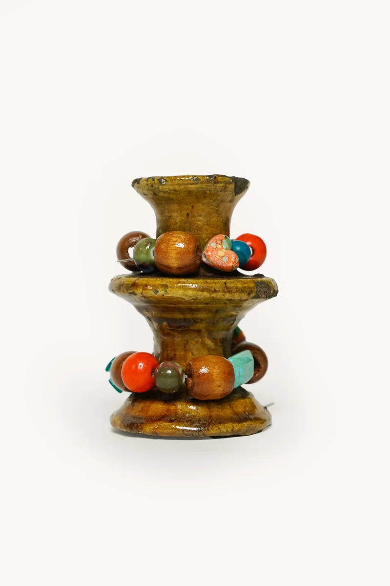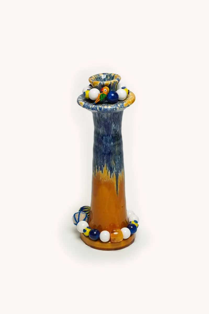 L’ÎLE BLEUE – BOUGEOIR TERRE CUITE EMAILLEE JAUNE ET BLEU