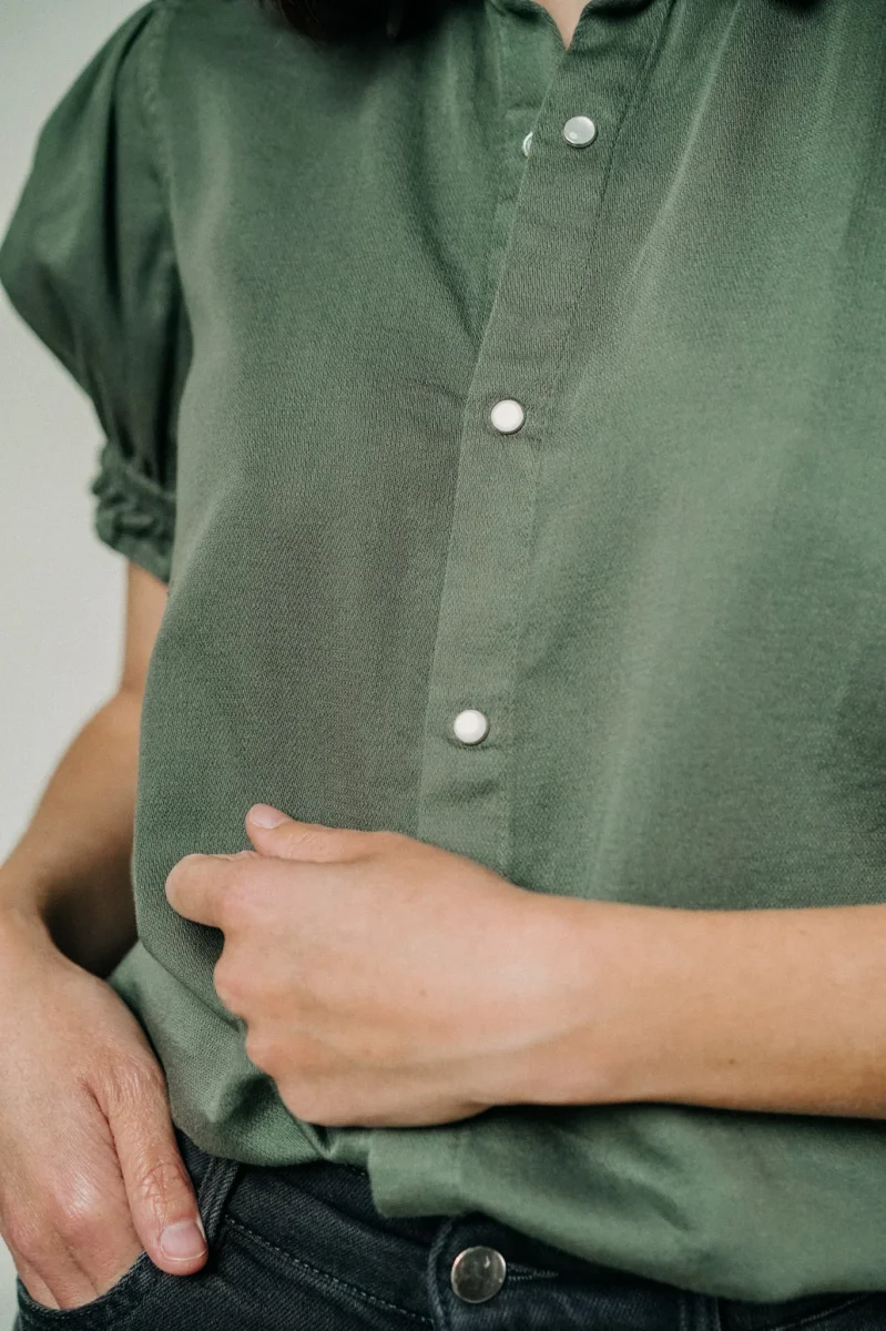contrebalancée par l’originalité des boutons pression argentés qui ferment le chemisier