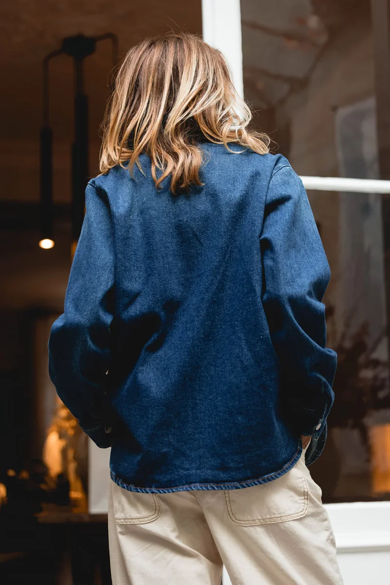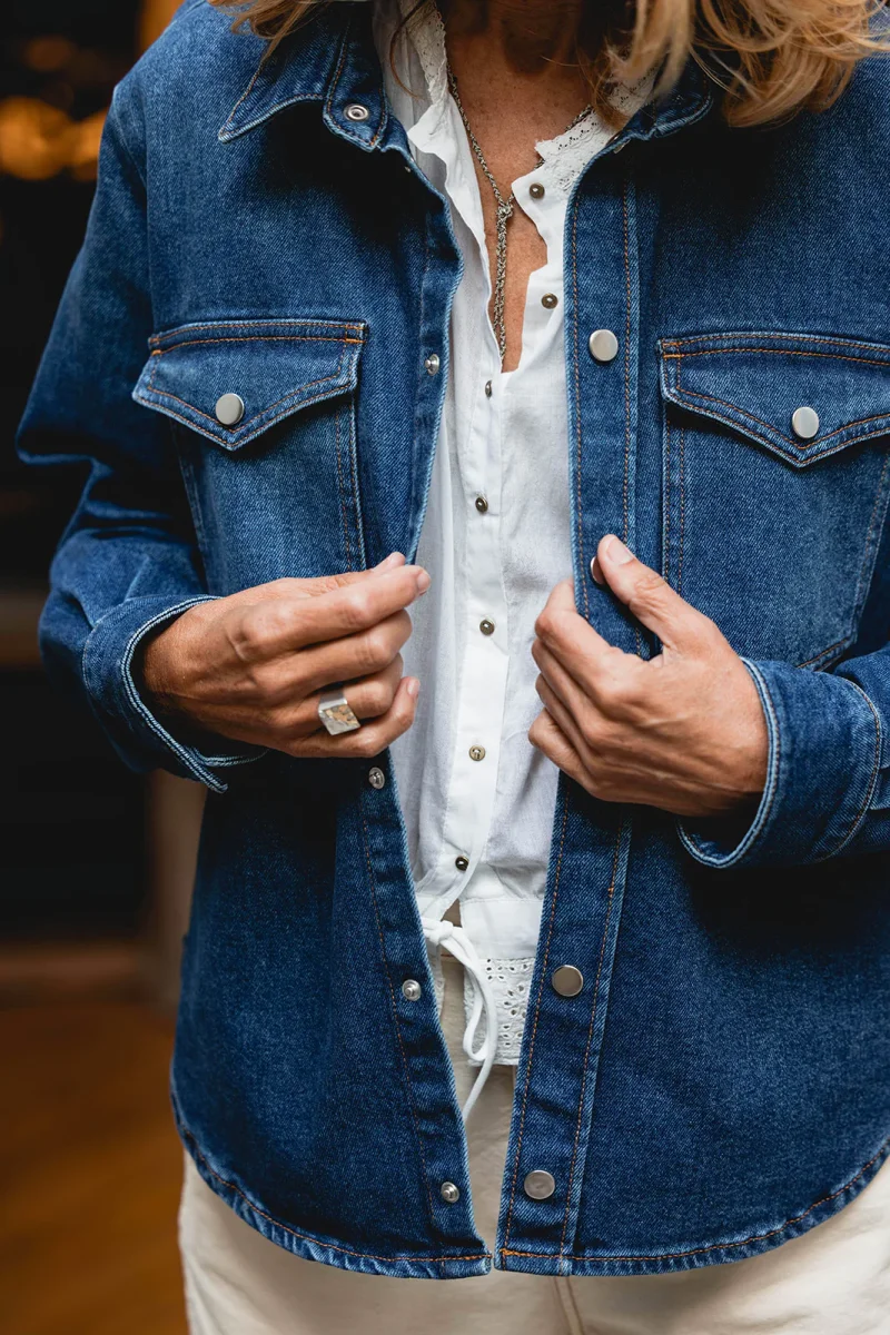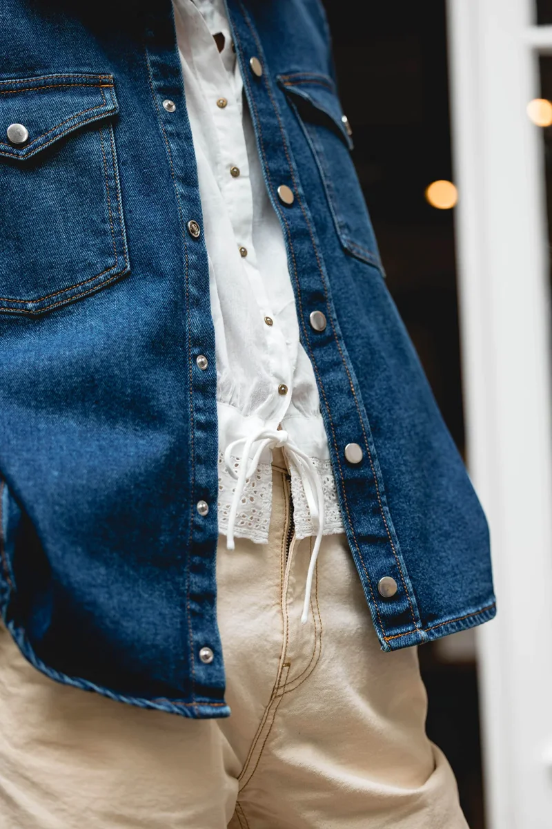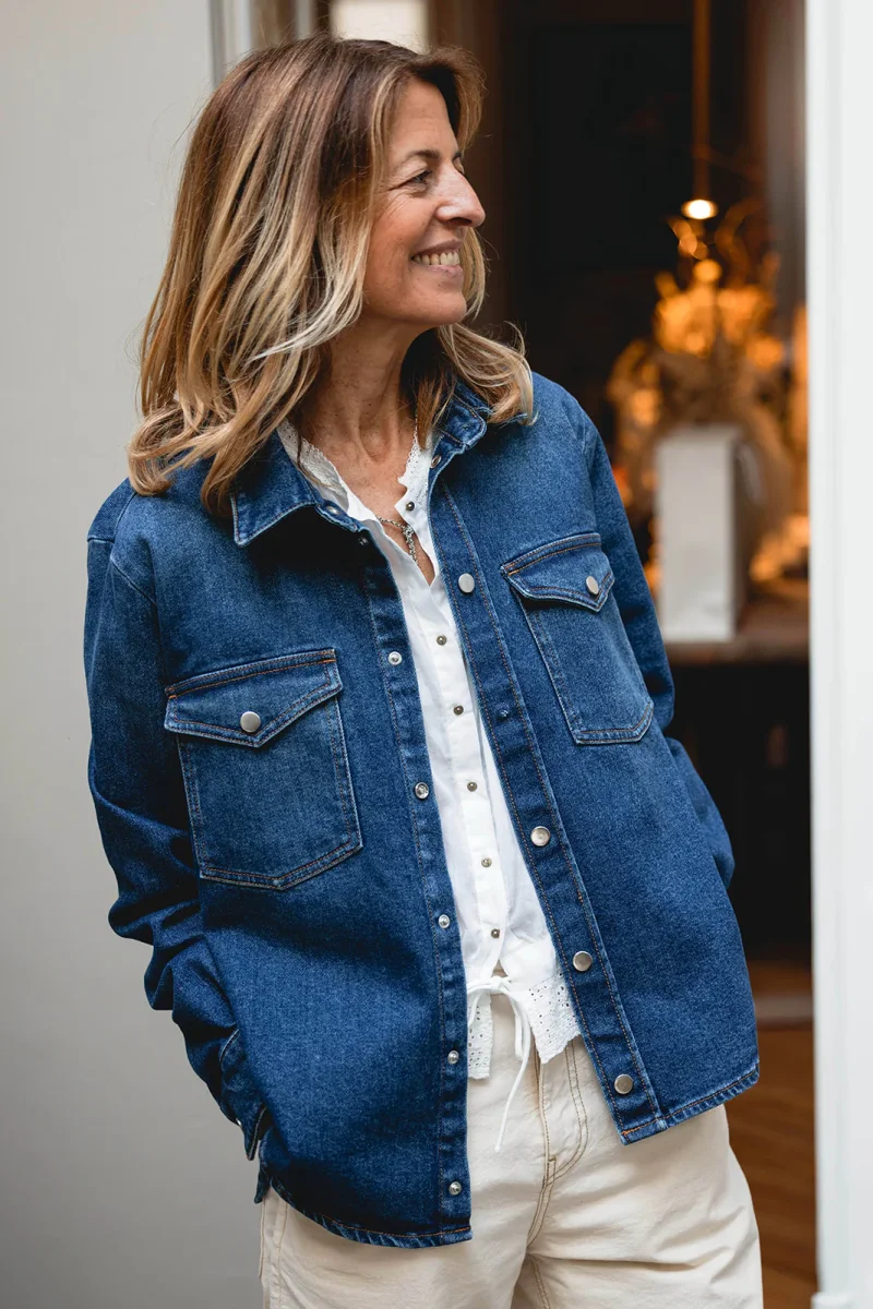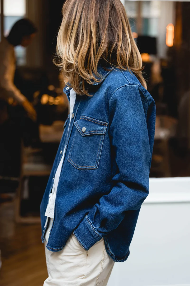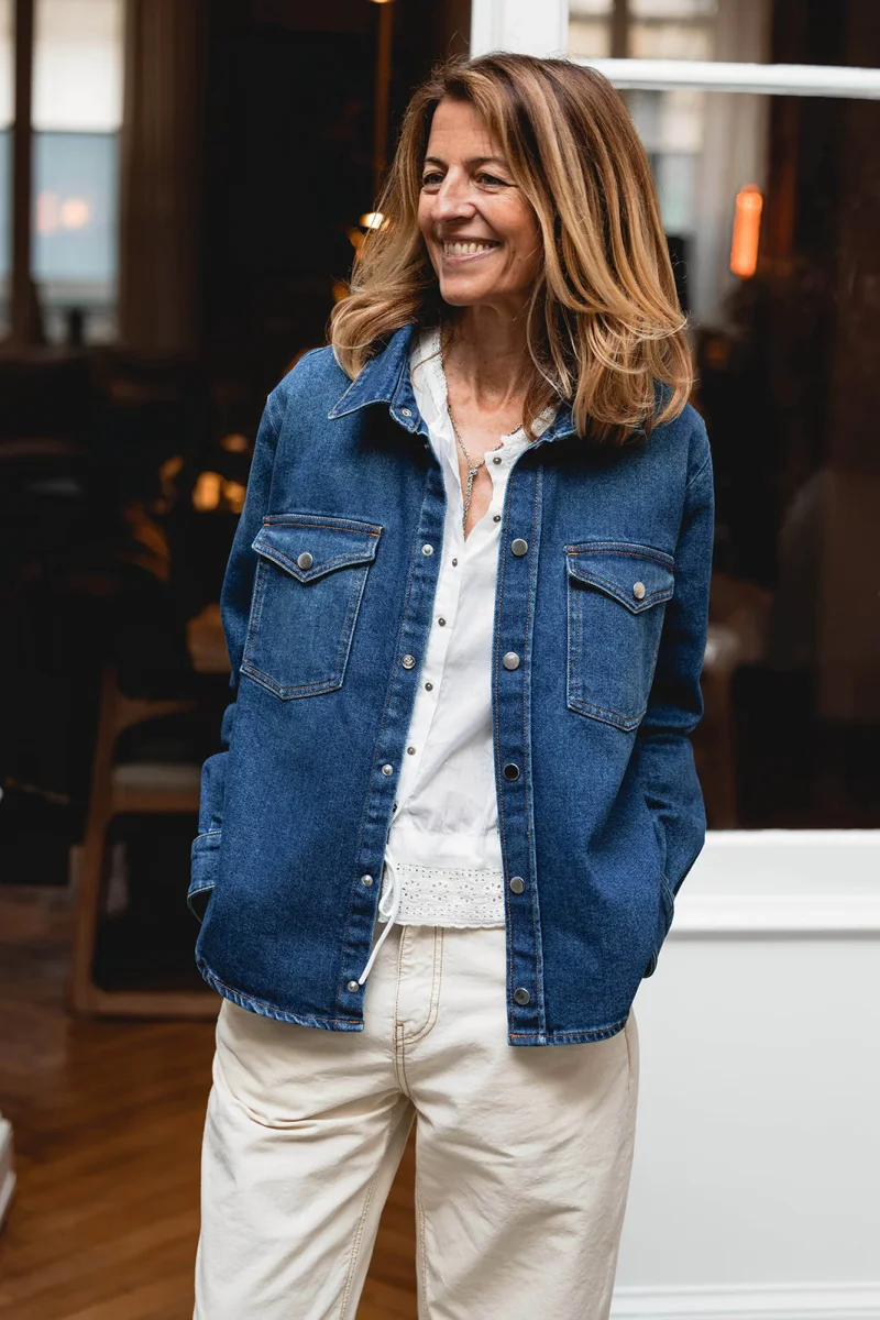 Chemise en denim idéale pour la mi-saison. La Topaze est 100% coton brut avec une boutonnière à pression nacré. Une coupe droite avec deux poches plaquées à l’avant, fermées par des boutons pression nacrés. Isabelle mesure 1m70 et porte une taille M.