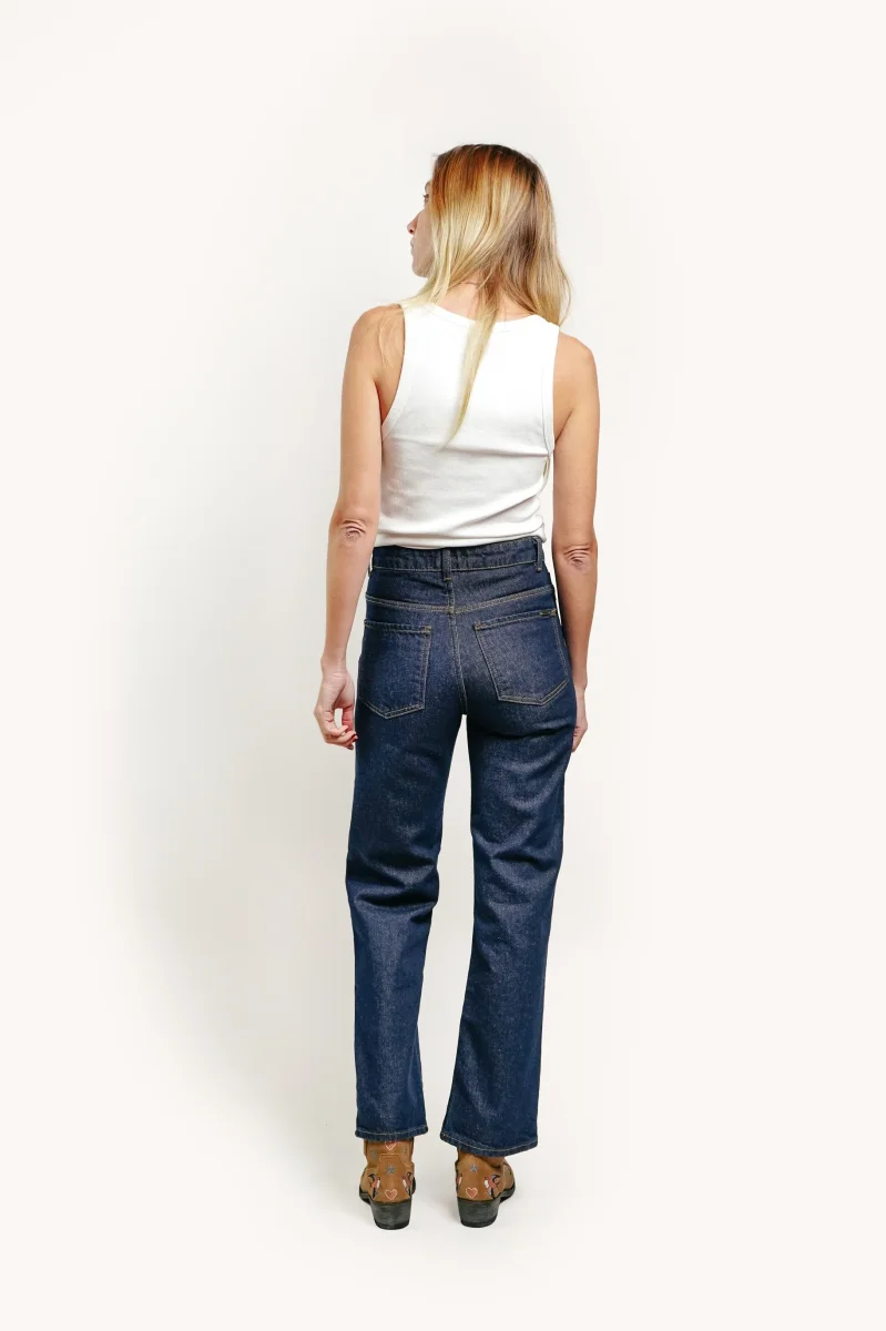 Le jean à une taille haute, une coupe droite (20cm bas de jambe).
