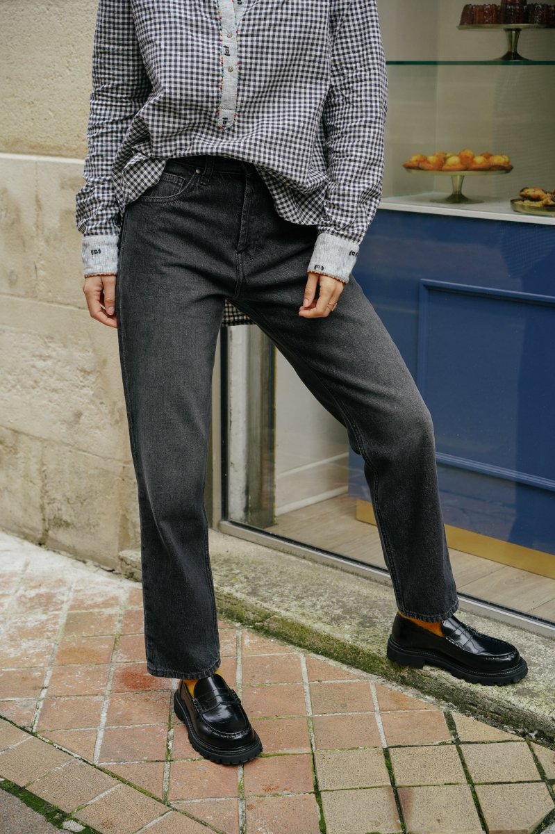 Le parfait jean Gloria en 100% coton dans un bleu subtilement délavé. Jean 5 poches. Le jean Richie a une coupe droite longueur cheville. Théophanie mesure 1m60 et porte une taille 23.