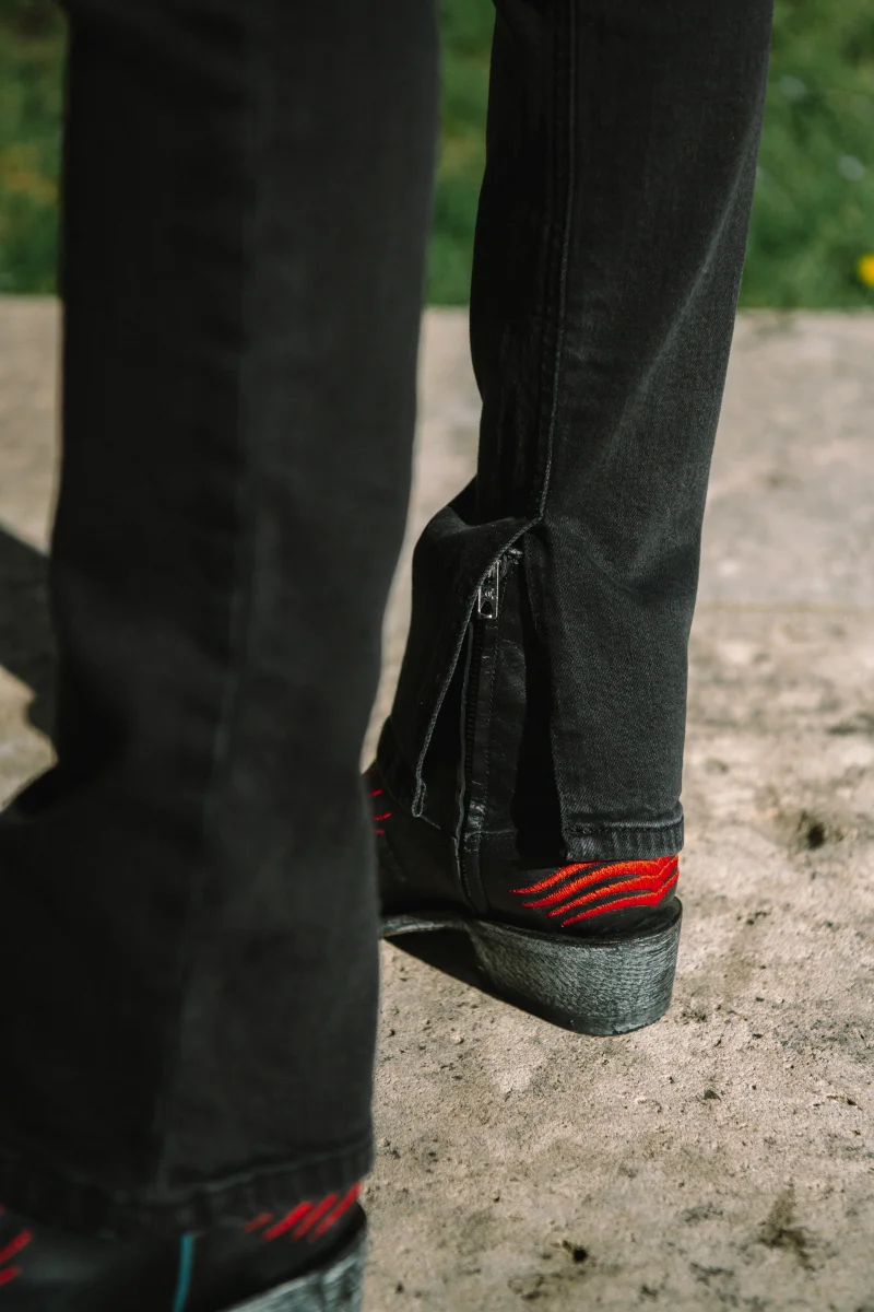 Jack a une taille haute, une coupe slim et évasé en bas avec une fente à la cheville.