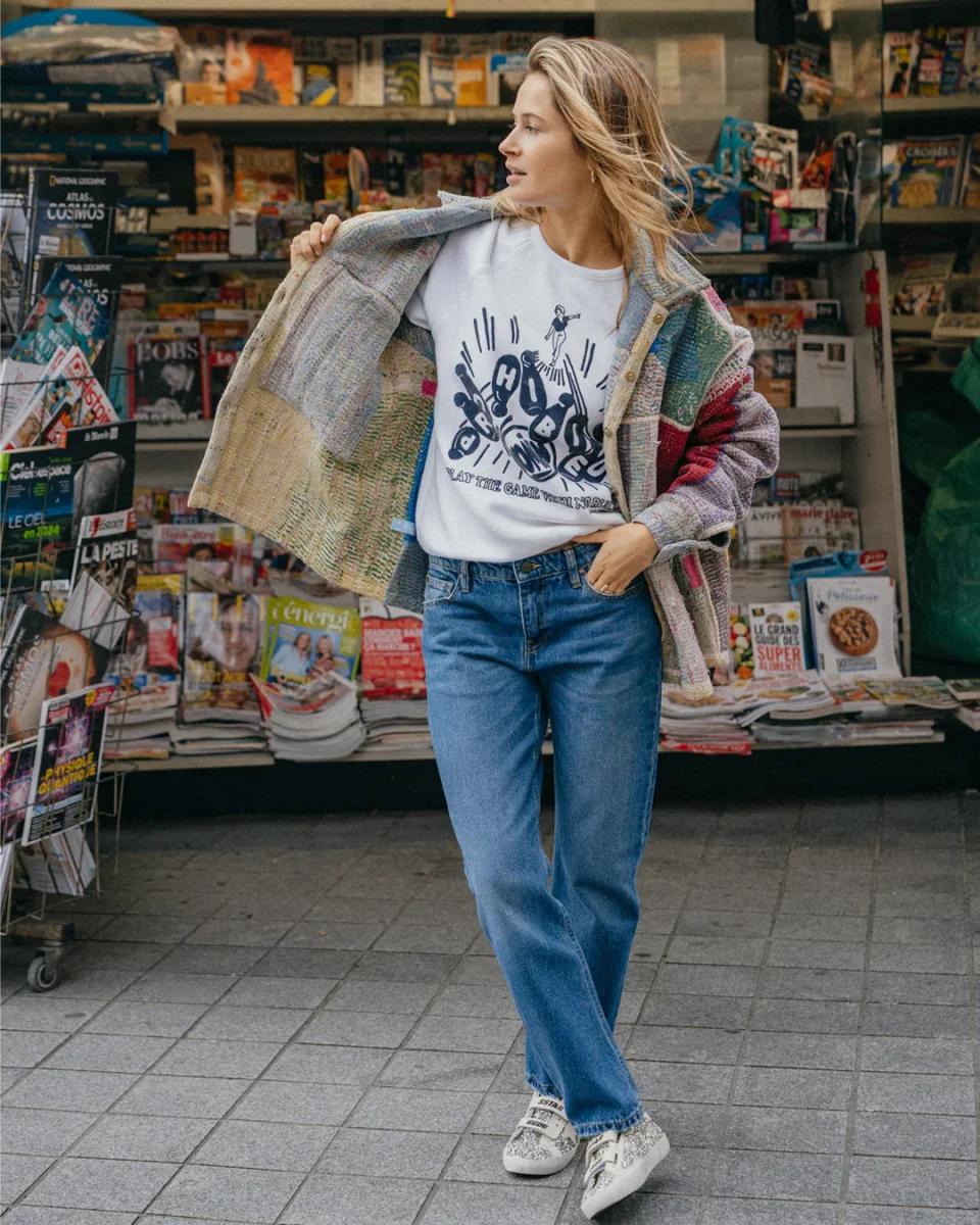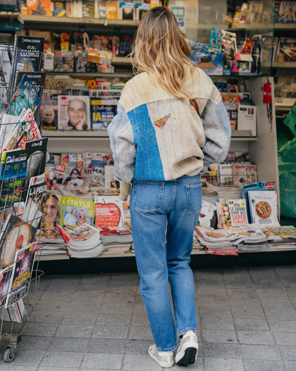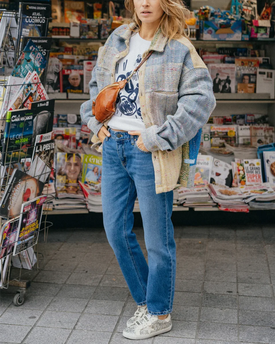 Le parfait jean New Nils en 100% coton dans un bleu soutenu subtilement délavé. 5 poches dont deux poches classiques à l’arrière. Le jean New Nils a une coupe droite longueur cheville. Théophanie mesure 1m61 et porte un 23.