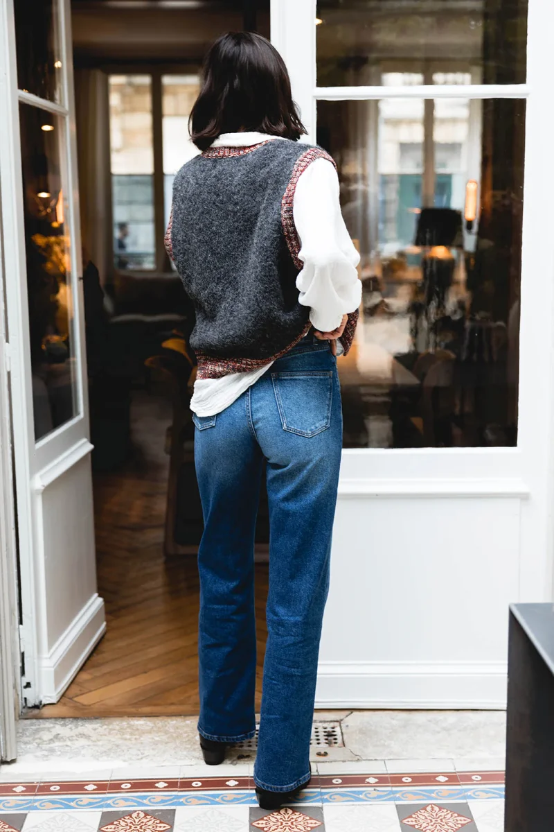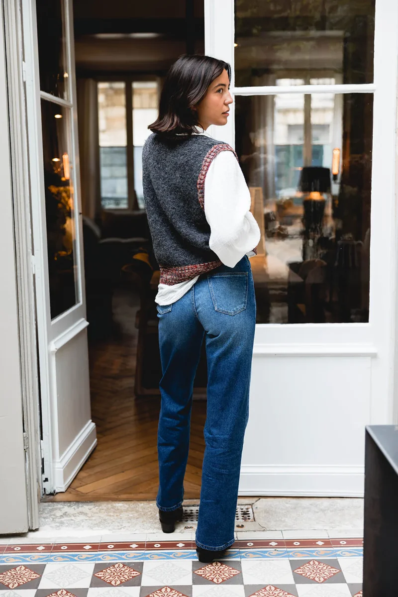 Le parfait jean Richie en 100% coton dans un bleu soutenu subtilement délavé. Jean 5 poches. Le jean Richie a une coupe droite légèrement large et long. Solveig mesure 1m78 et porte un 25.