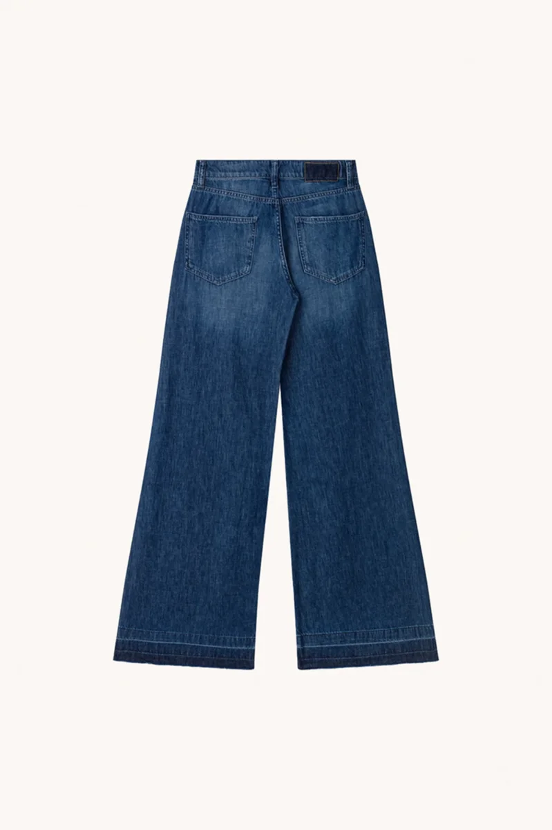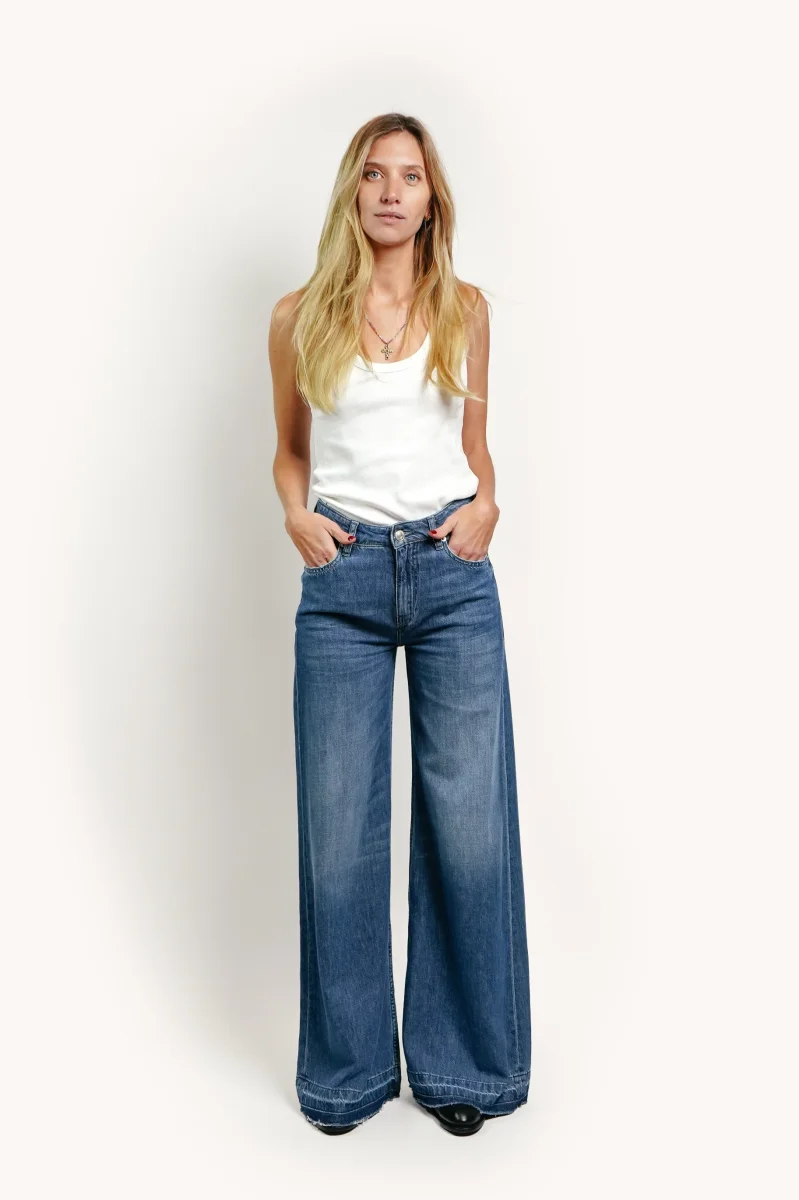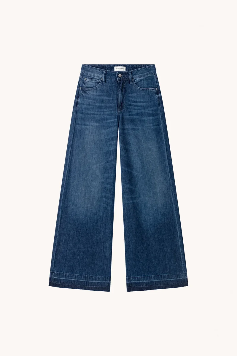 Sa taille haute et ses jambes très évasées apportent une silhouette flatteuse et tendance. Le bas du jean dévoile un effet frangé et un jeu de teinture/délavage obtenu grâce à une technique artisanale de couture, délavage et découture, rendant chaque pièce unique.