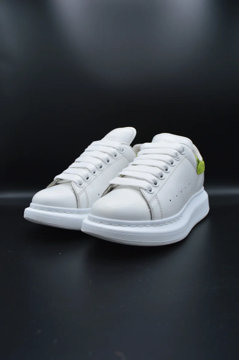 Détails de l’article : Marque : Alexander Mcqueen Modèle : Oversize Pointure : 36 Etat : Très bon état Couleur : Blanc et jaune fluo Matière : Cuir lisse de veau et cuir effet python Accessoires inclus : Lacets de rechange