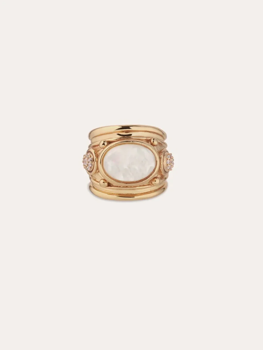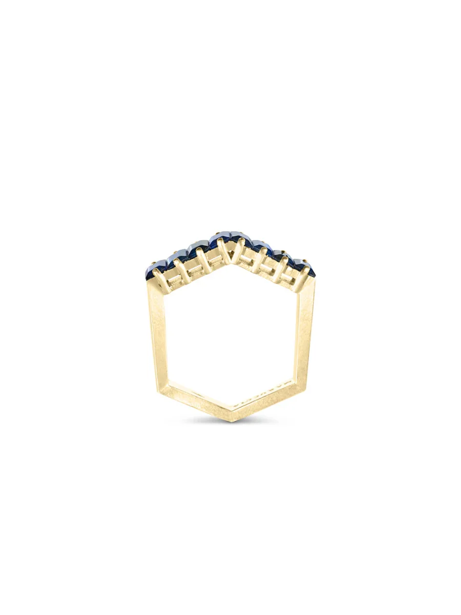 Bague « 6 » signée Maruccia confectionnée en or jaune 18 carats serti de huit saphirs bleus taille émeraude. Une anneau de forme hexagonale en or à l’effet givré.