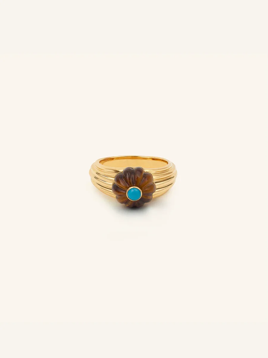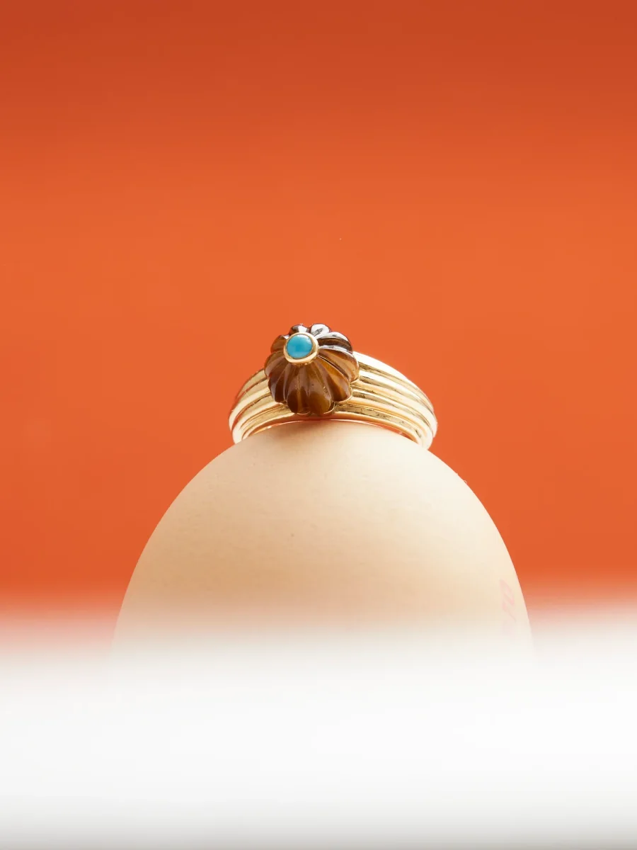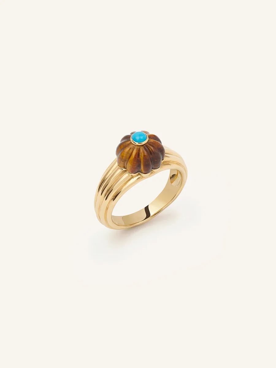 Cette bague Gelato oeil-de-tigre et turquoise est imaginée par la créatrice Salomé Rico. Elle se compose d’un half melon cut en oeil-de-tigre avec cabochon en turquoise et d’un anneau en or jaune godronné 18 carats. Réalisée à la main à Paris, cette pièce forte reflète l’ADN de la maison.