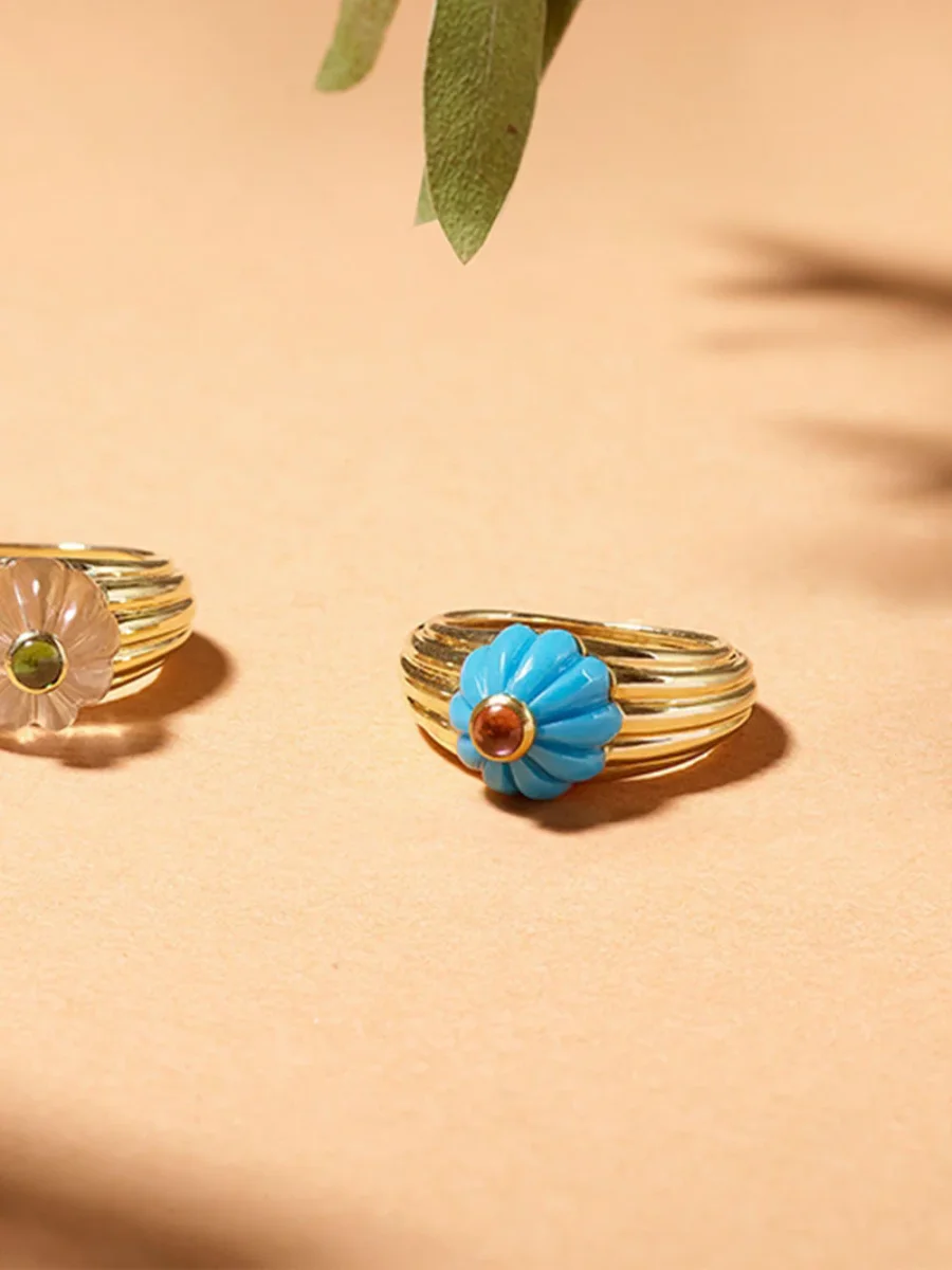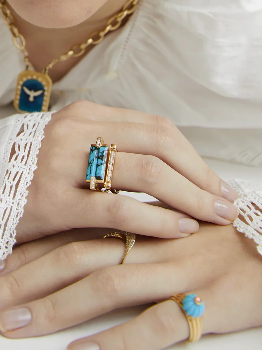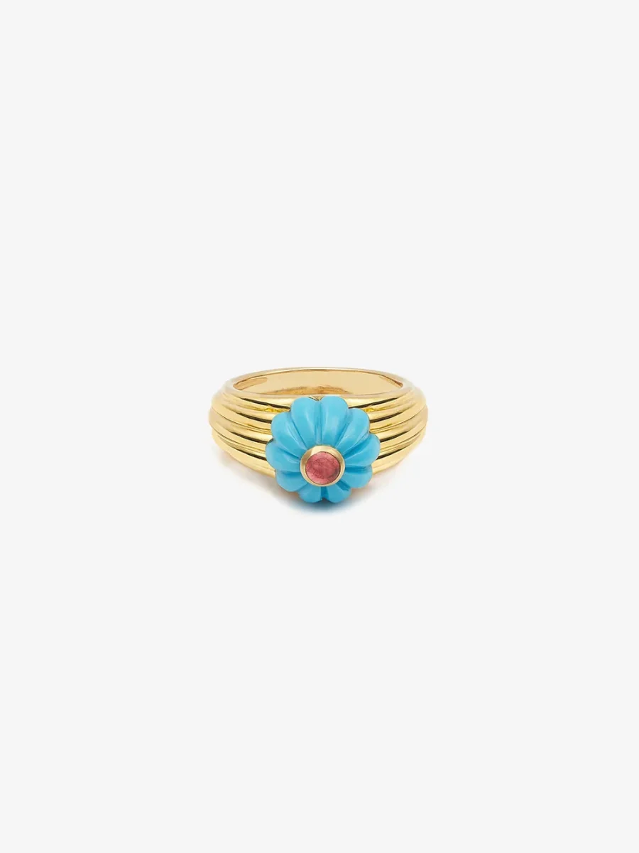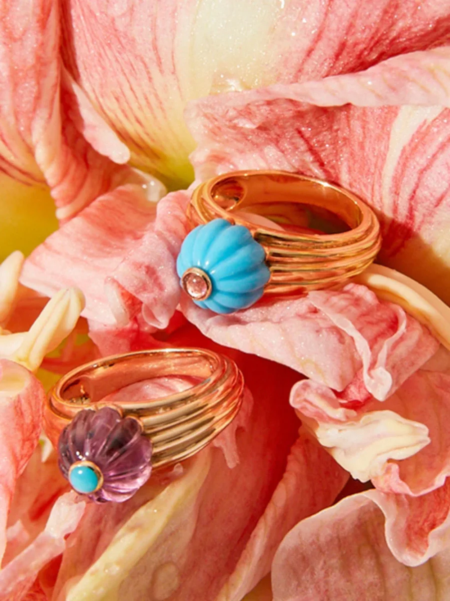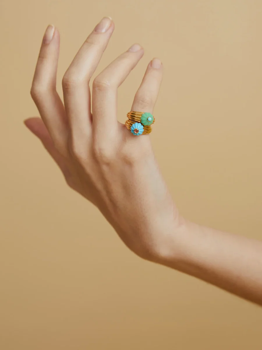 Cette bague Gelato turquoise et tourmaline rose est imaginée par la créatrice Salomé Rico. Elle se compose d’un half melon cut en turquoise avec cabochon en tourmaline rose et d’un anneau en or jaune godronné 18 carats. Réalisée à la main à Paris, cette pièce forte reflète l’ADN de la maison.