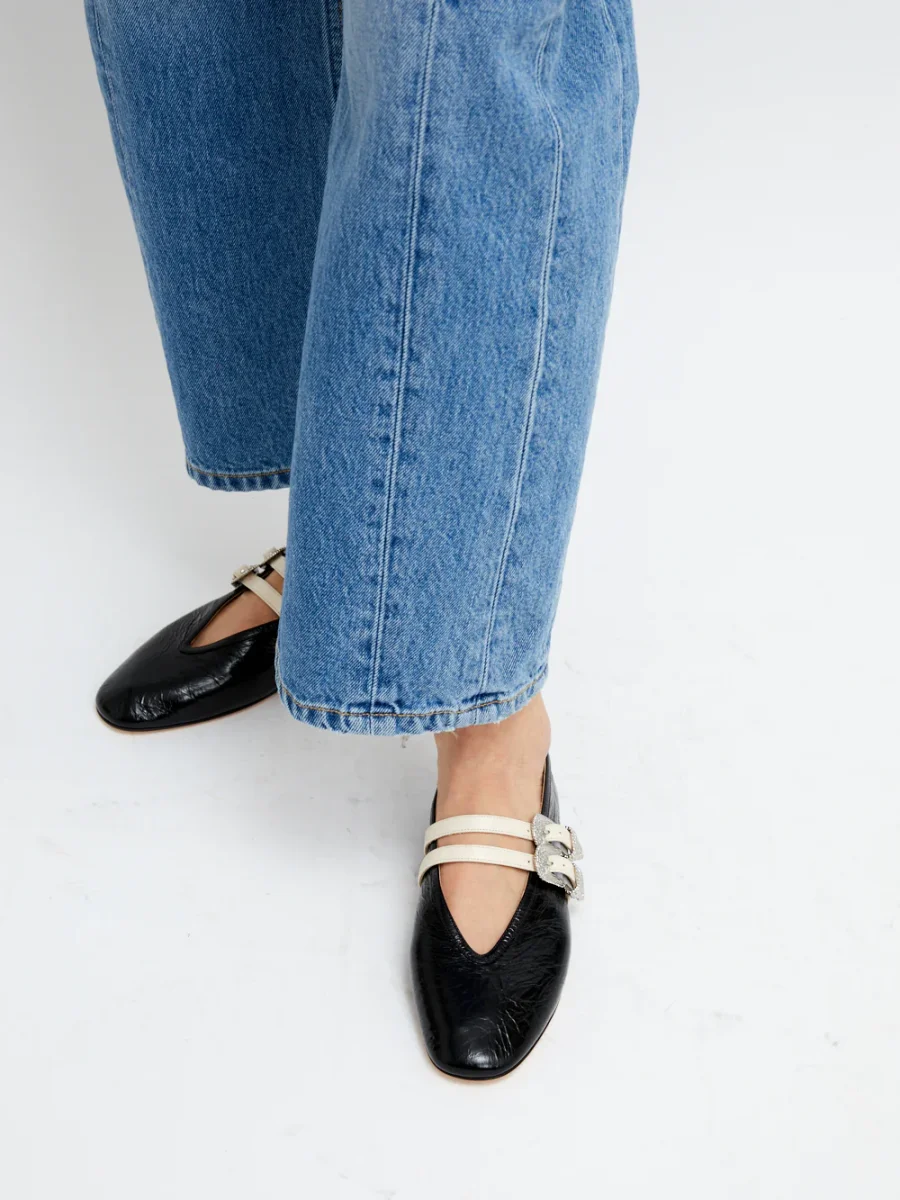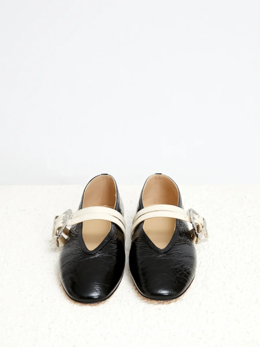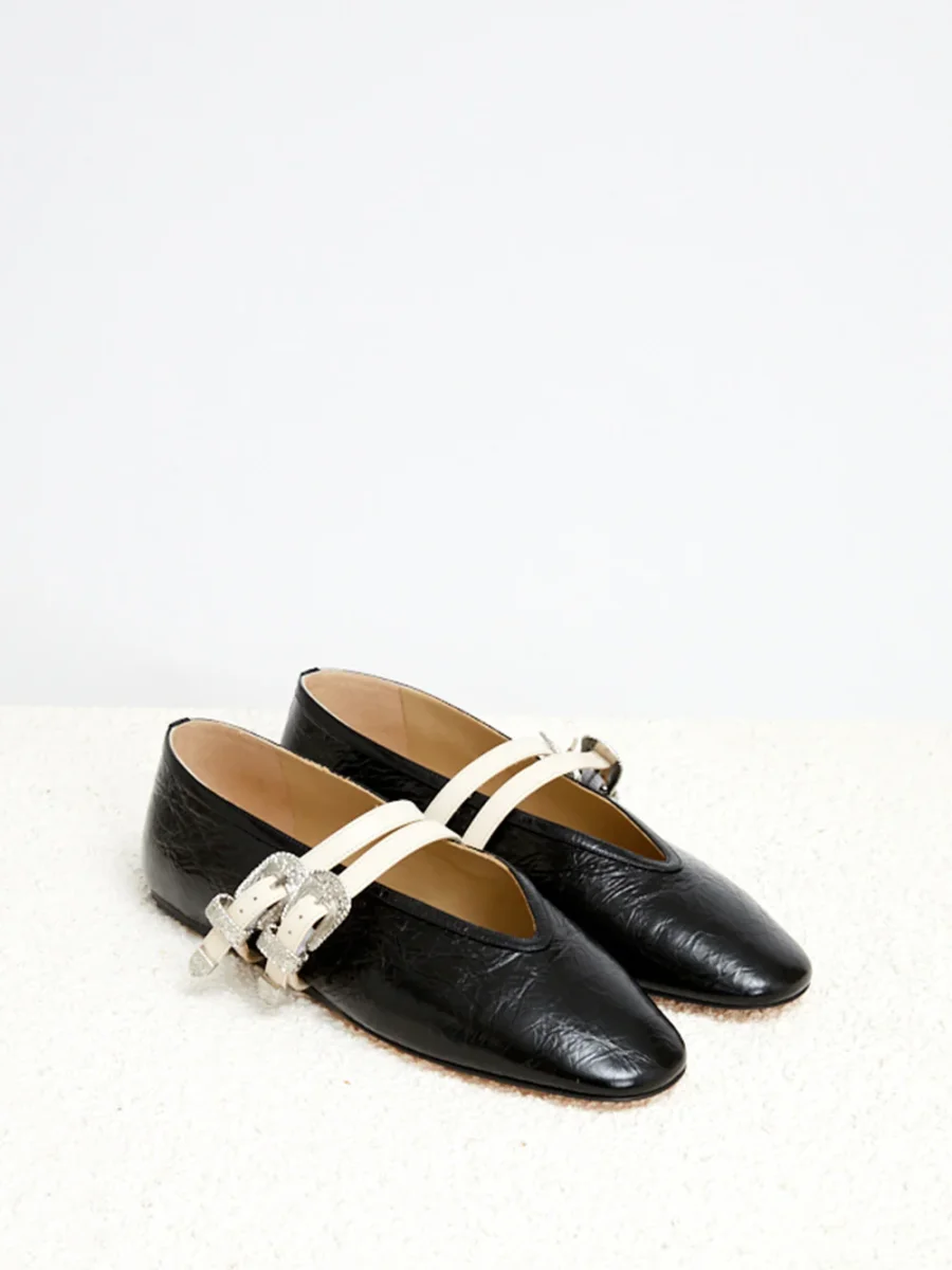 Ballerines Claudia Cuir Froissé signé Le Monde Beryl confectionné en cuir froissé noir. Une chaussure plate classique agrémentée de de deux boucles au style western pour maintenir le pied.