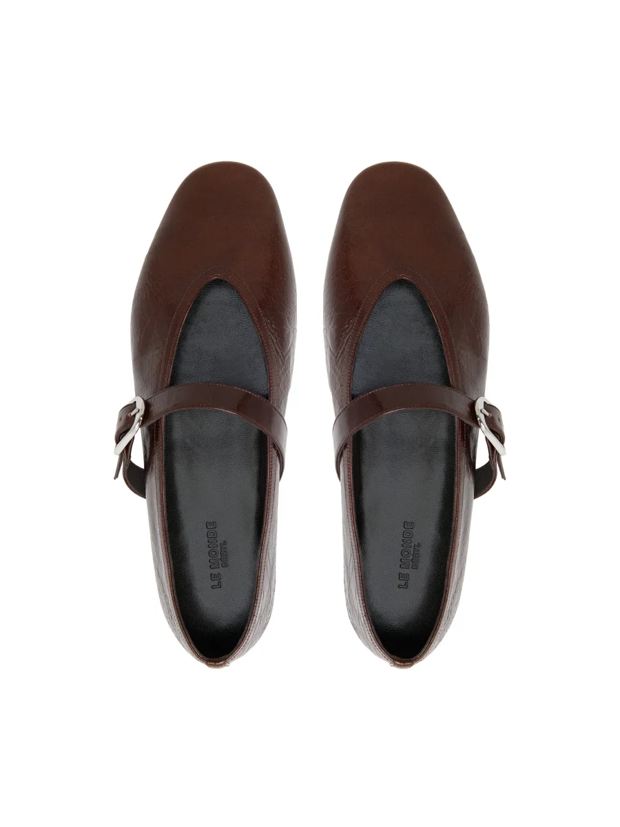 Ballerines Stella signées Le Monde Beryl confectionnées en cuir froissé de couleur marron. Une chaussure plate accompagnée d’une boucle pour maintenir le pied.