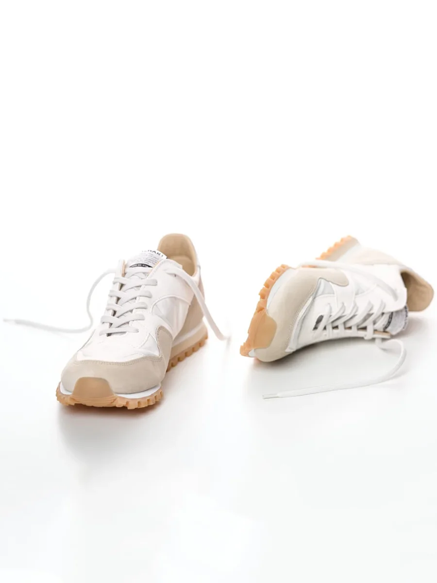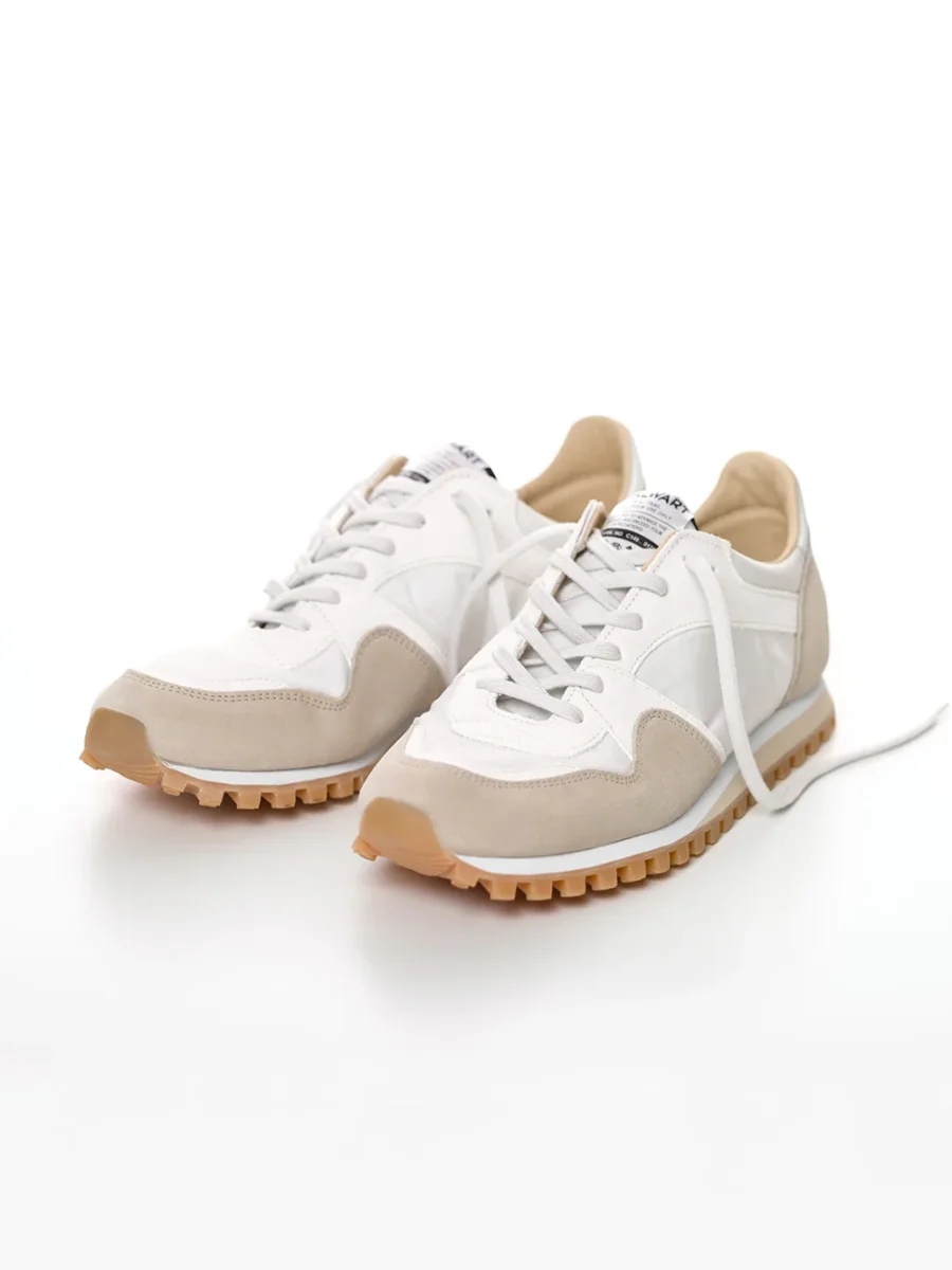 Sneakers Marathon Trail Low Spalwart. Ces baskets basses en nylon blanc et cuir suédé beige sont à bout rond et se ferment à l’aide de lacets blancs. Le logo Spalwart est tissé sur la languette rembourrée. Les baskets sont doublées en cuir et les semelles sont crantées en caoutchouc naturel.