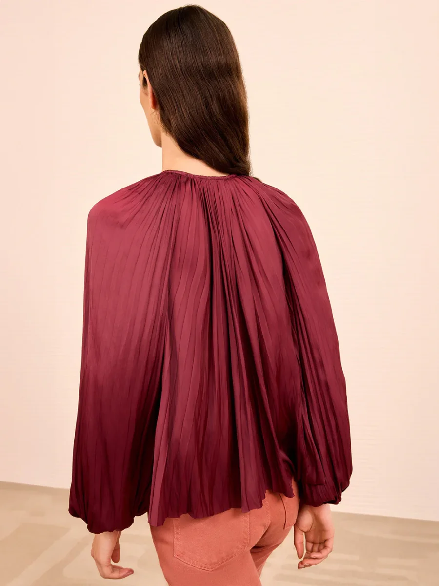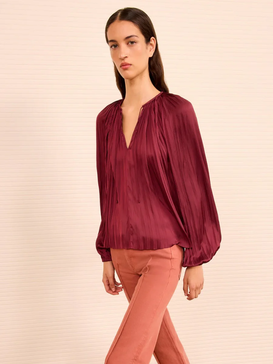 Blouse Claret signée Ulla Johnson confectionné dans un tissu satiné de couleur bordeaux. Une blouse légère plissée et aux manches bouffantes. – Décolleté en V accompagné d’une noeud délicat – Poignets resserrés élastiques – Le mannequin mesure 1m78