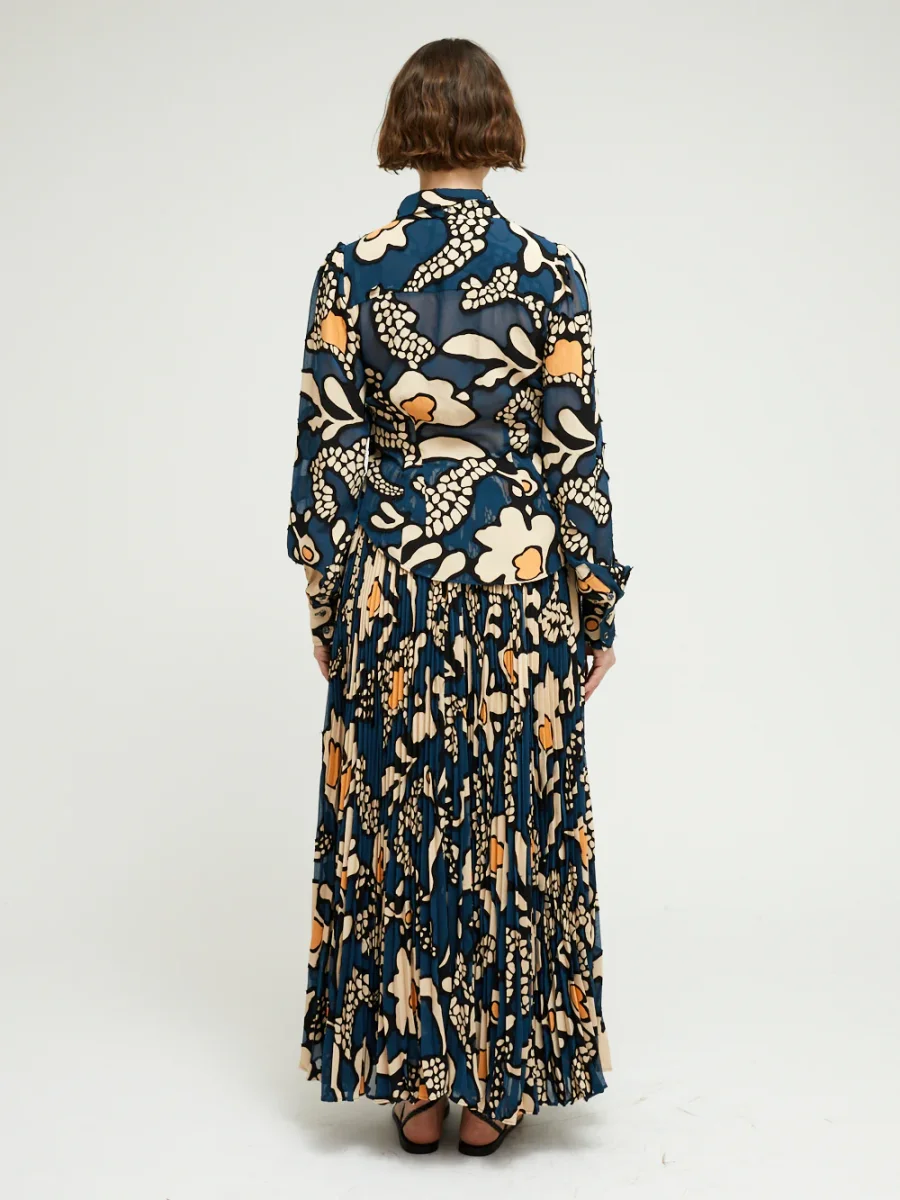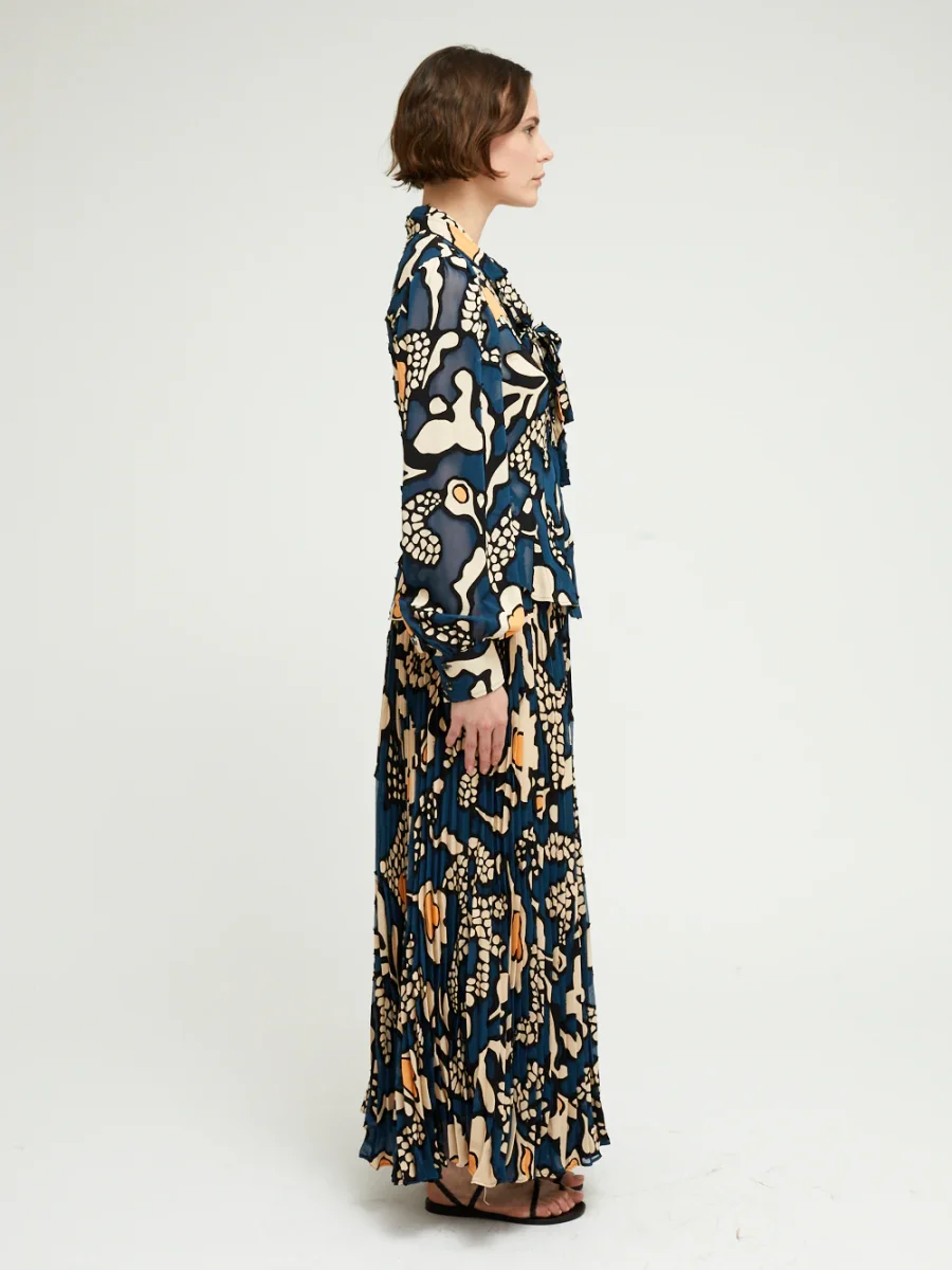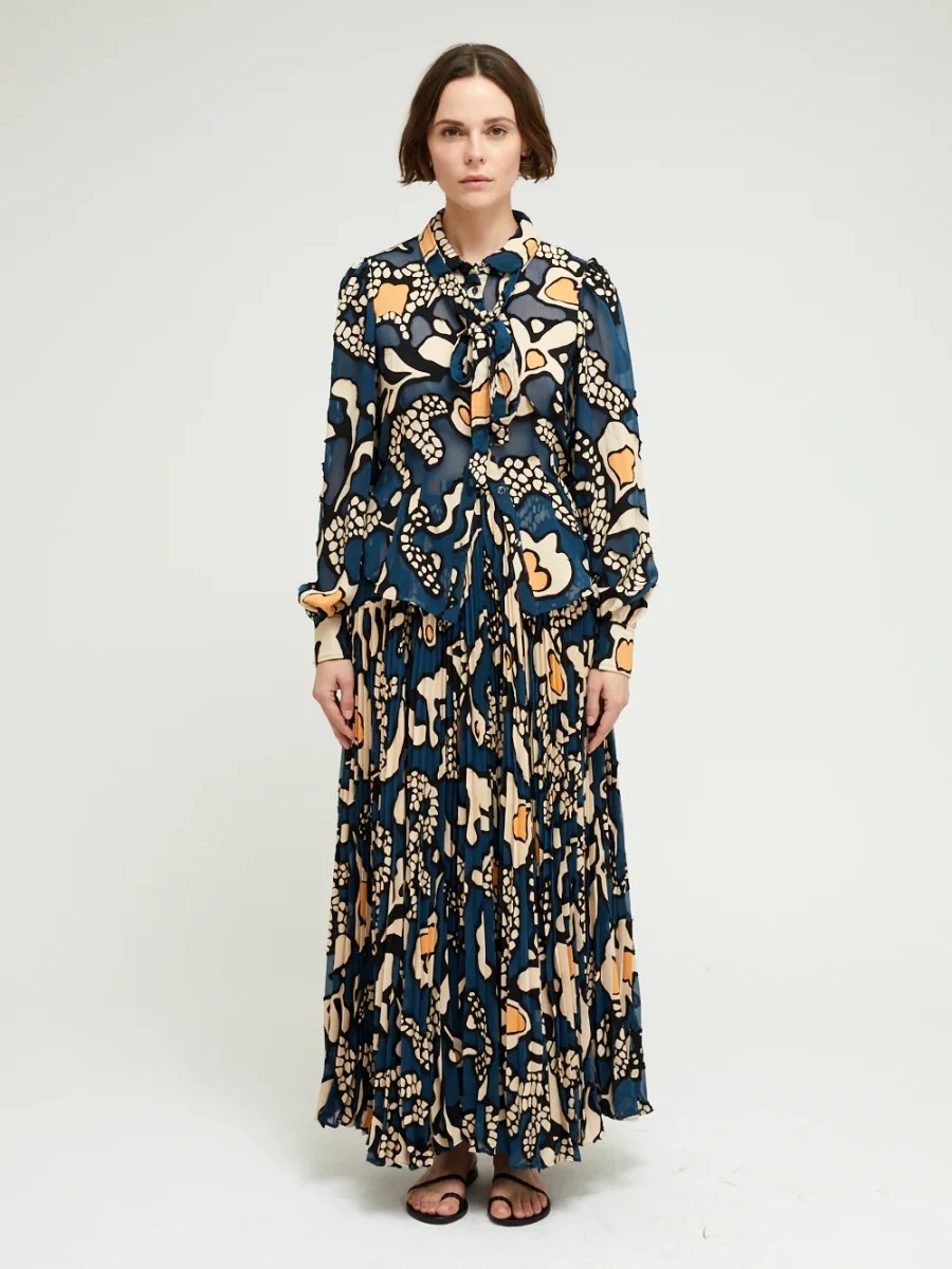 Blouse Hera Célestine signée Ulla Johnson confectionnée dans un tissu dévoré en transparence bleu pétrole. Une blouse lavallière accompagnée de motifs floraux abstraits appliqués. – Manches longues légèrement bouffantes – Fermeture boutonnée sur le devant accompagné d’un noeud autour du cou