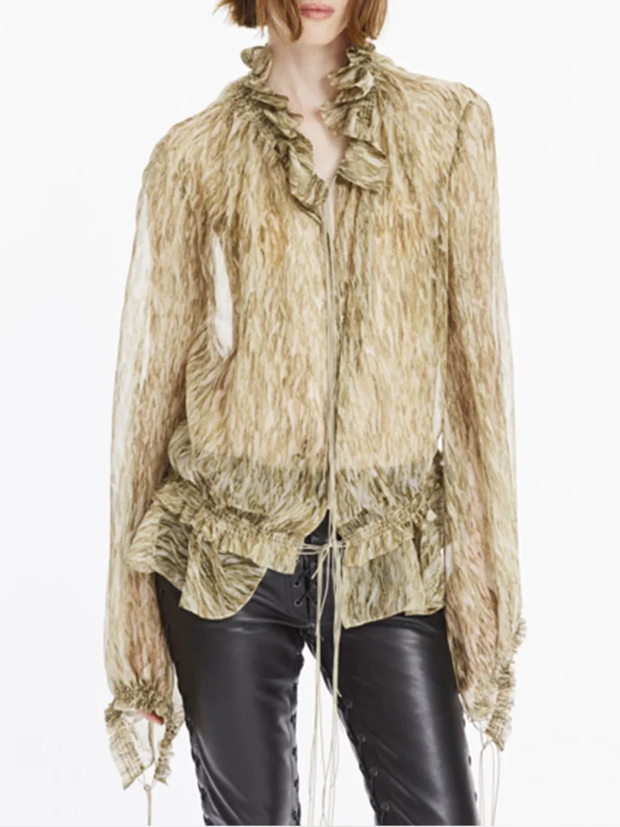 La blouse Lei imprimée du créateur Petar Petrov est un haut en voile de Soie semi-transparent dans les tons de vert et beige avec des détails froncés et des liens à nouer à l’encolure et sur les poignets. Son col et ses poignets volantés, ses manches longues amples et les fronces à la taille lui donnent de la structure et un côté vintage et loose.