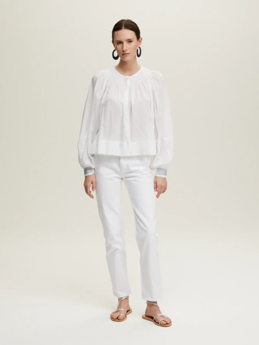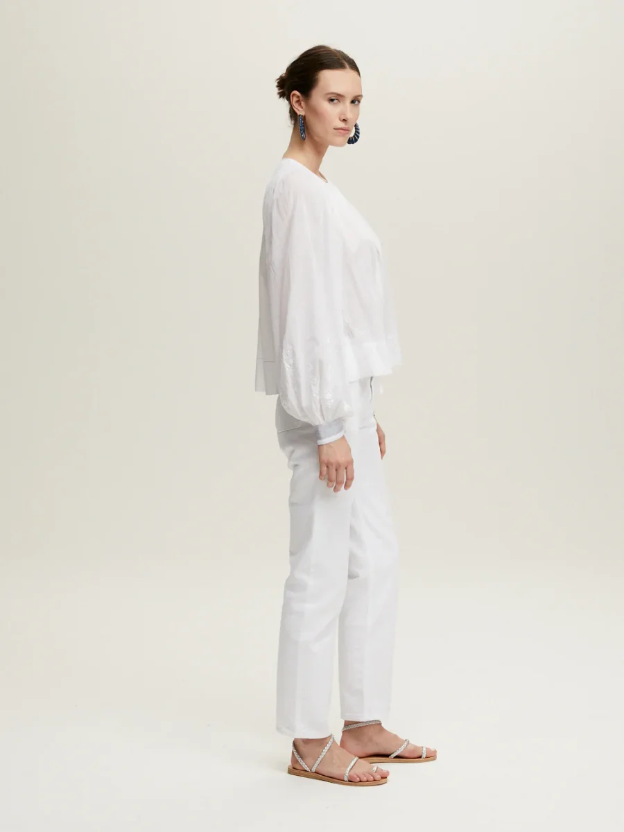 Blouse Margot signée Jane Gustavsson confectionnée en coton organique blanc tissé à la main. Une blouse à la couple ample et aux manches bouffantes, brodée de fleurs blanches ton-sur-ton.