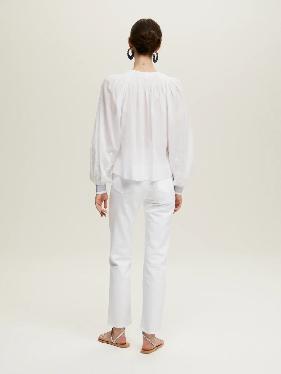 Blouse Margot signée Jane Gustavsson confectionnée en coton organique blanc tissé à la main. Une blouse à la couple ample et aux manches bouffantes, brodée de fleurs blanches ton-sur-ton. – Fabriquée en Inde – Col rond smocké – Manchettes resserrées piquées en fil bleu marine – La mannequin mesure 1m76 et porte une taille 2