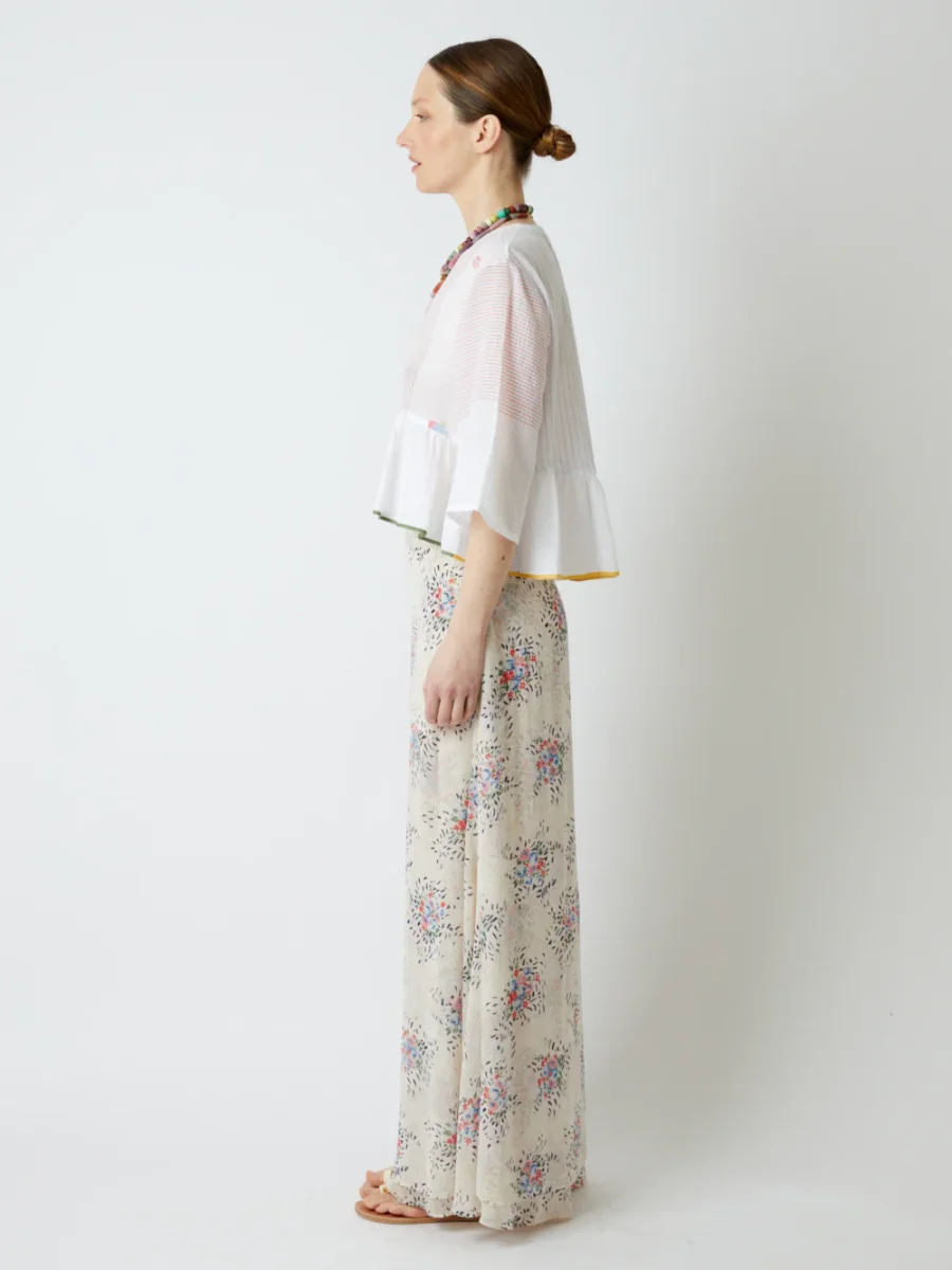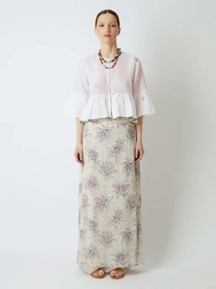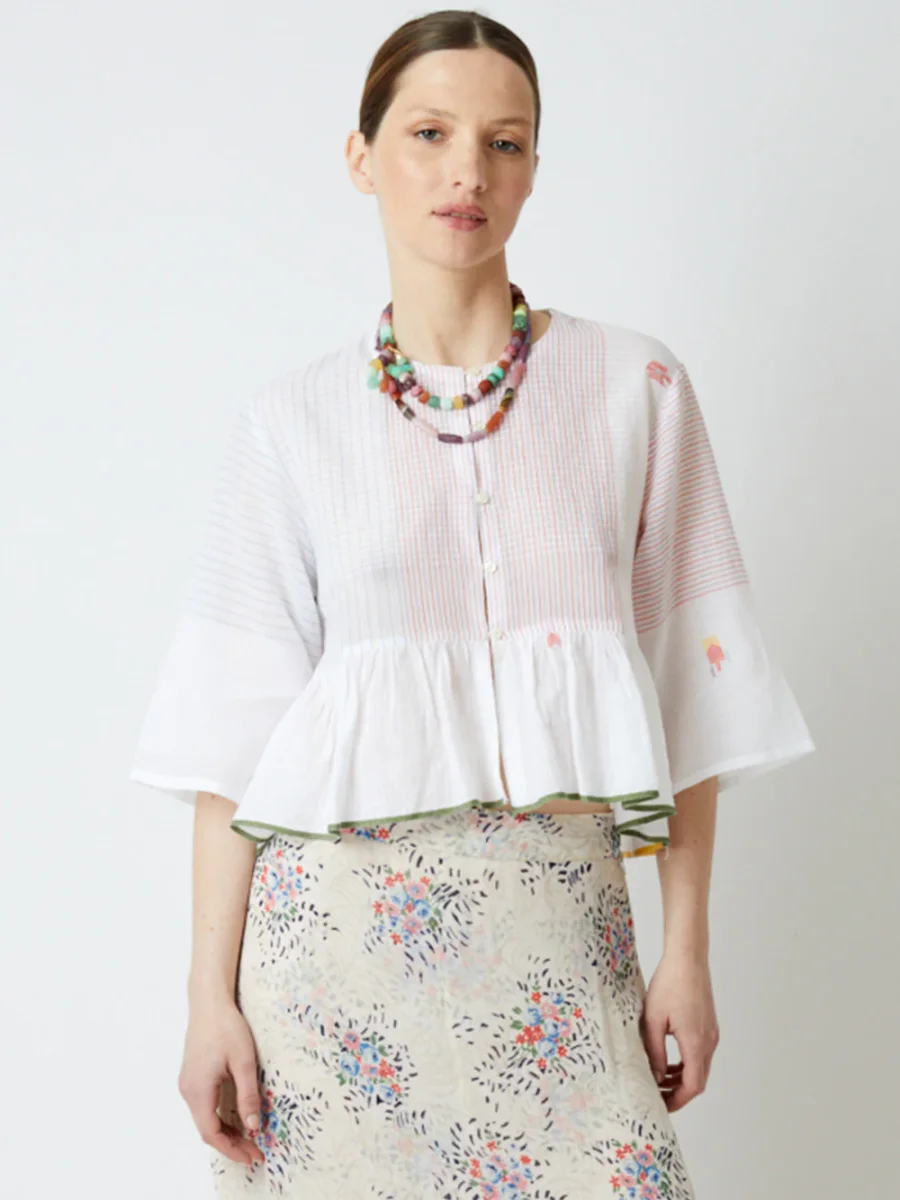 Blouse Ama signée Jane Gustavsson confectionnée en coton tissé à la main « Jamdani ». Un top coupe Péplum aux manches 3/4.