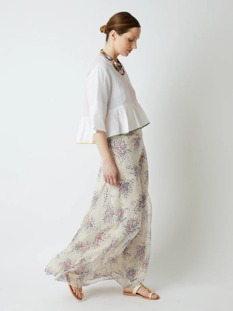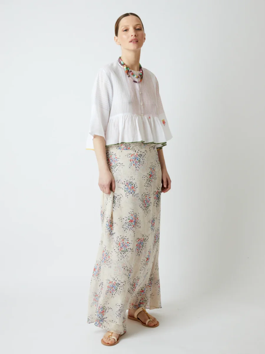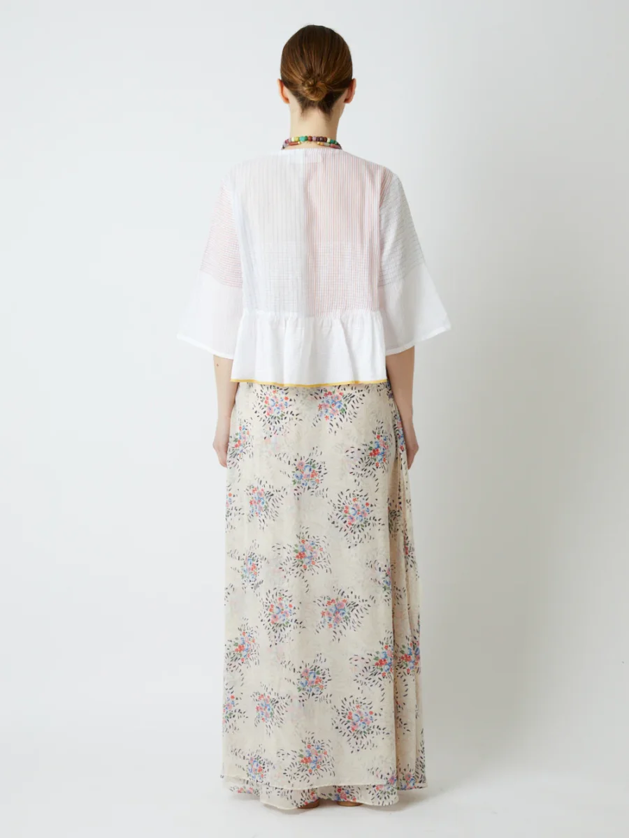 Blouse Ama signée Jane Gustavsson confectionnée en coton tissé à la main « Jamdani ». Un top coupe Péplum aux manches 3/4.