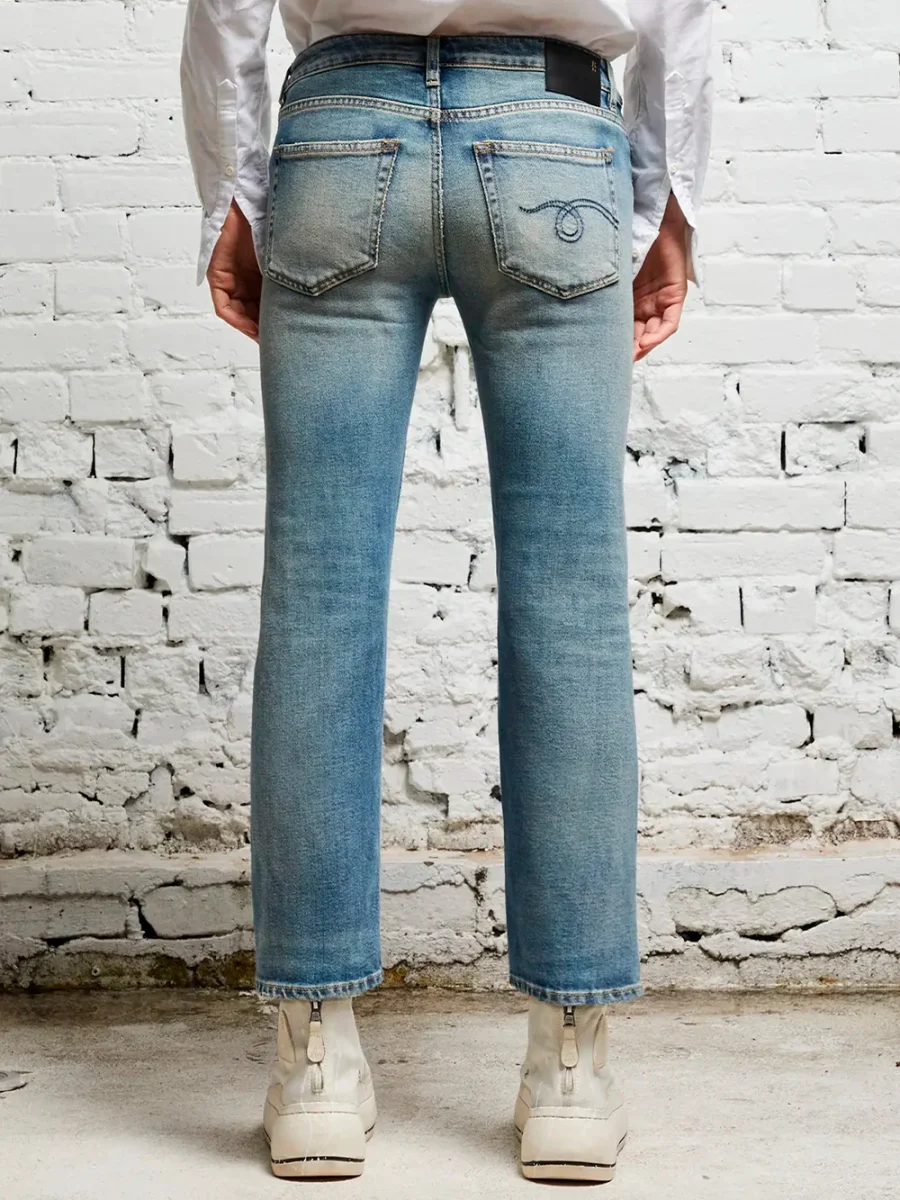 Le jean Boy Straight de R13 est réalisé en coton. La coupe est droite et la taille est basse. – Matière stretch et confortable – Cinq poches – Passants à la taille pour enfiler une ceinture – Couleur : bleu délavé – Fabriqué en Italie