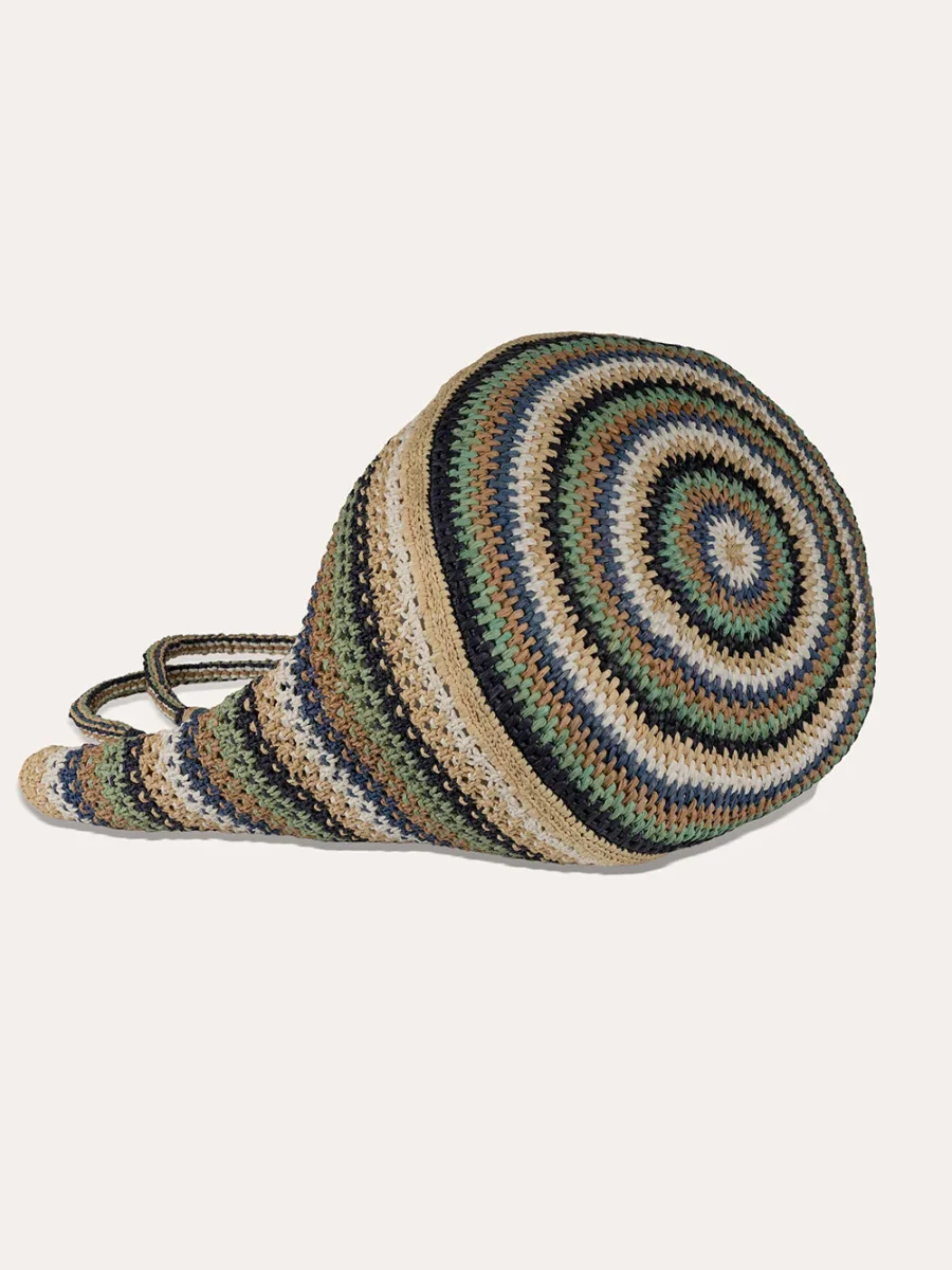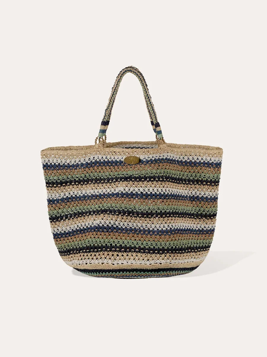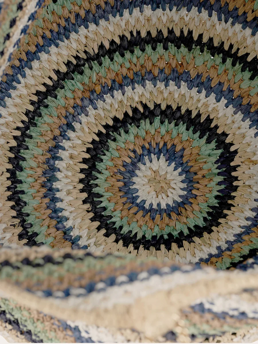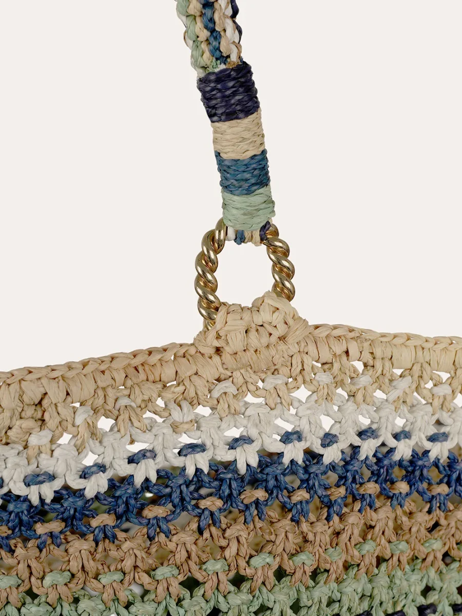 Cabas Bambou Abysse signé Gas Bijoux confectionné à la main en raphia dans les tons bleu, vert et marron. Notre sac Cabas Bambou. Un délicat tissage en macramé, sublimant la matière à travers un jeu raffiné de noeuds noués selon un savoir-faire artisanal.