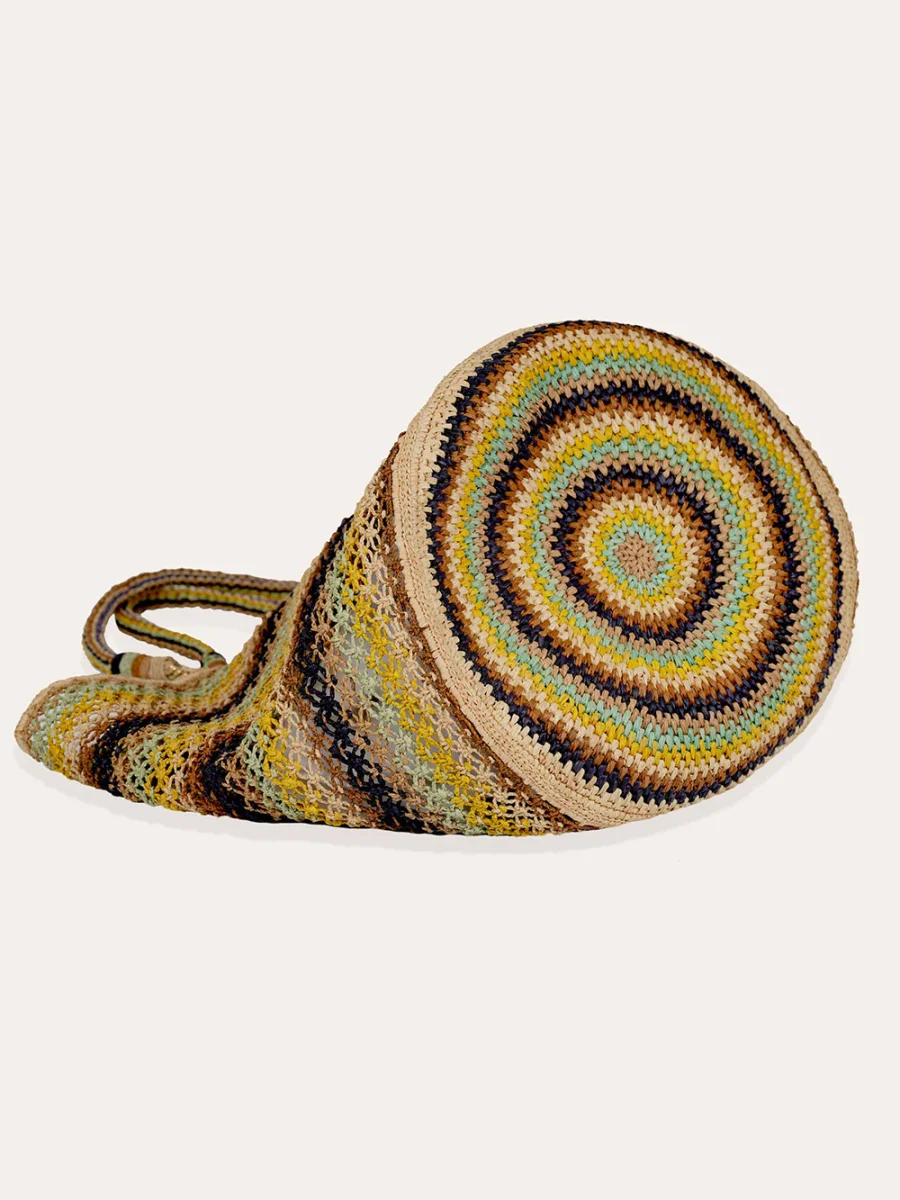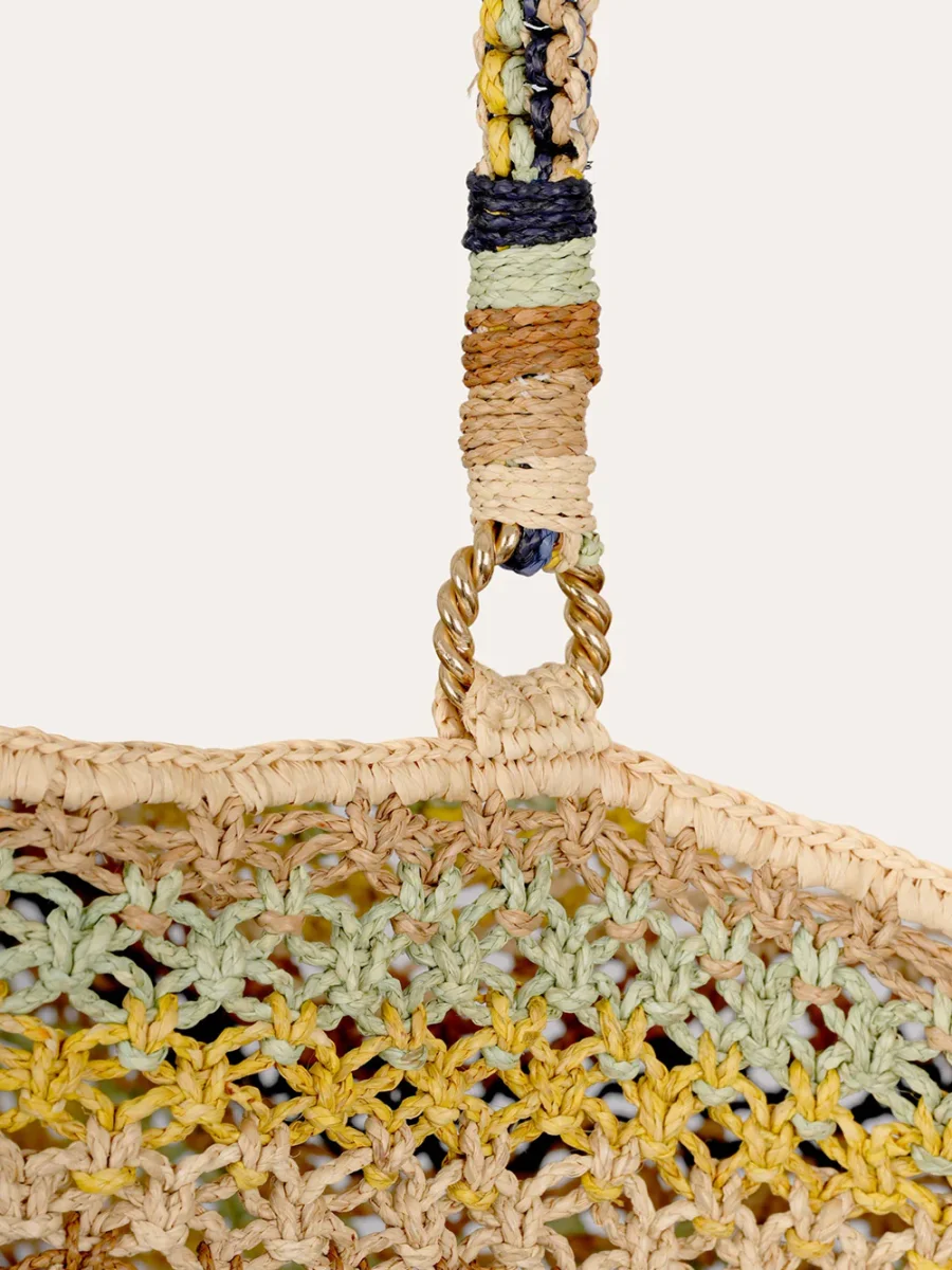 Cabas Bambou Abysse signé Gas Bijoux confectionné à la main en raphia dans les tons bleu, vert et jaune. Notre sac Cabas Bambou. Un délicat tissage en macramé, sublimant la matière à travers un jeu raffiné de noeuds noués selon un savoir-faire artisanal.