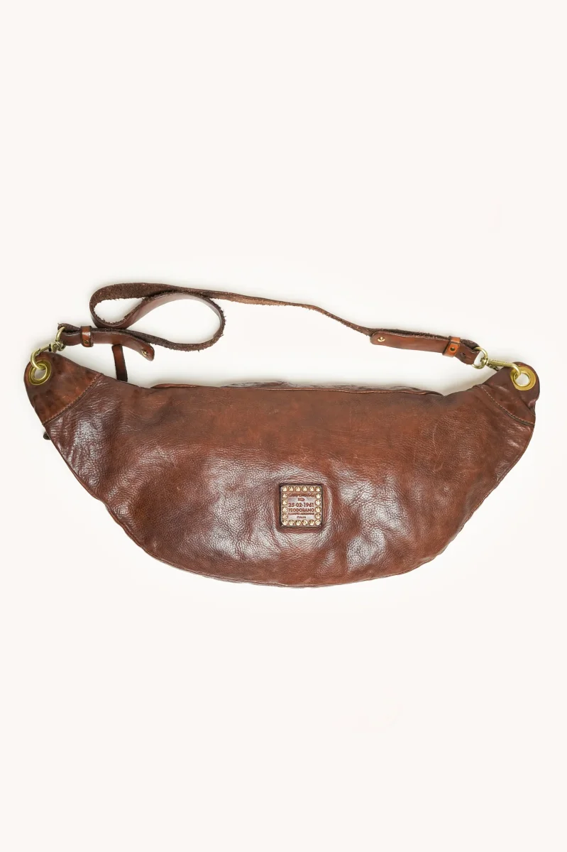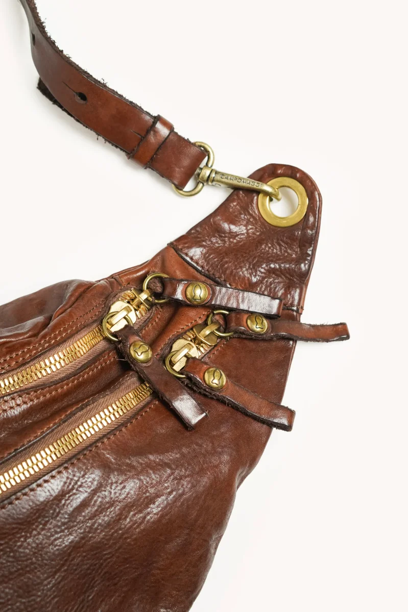 Les détails artisanaux, comme les coutures apparentes, les pièces métalliques vieillies et les finitions travaillées, soulignent le savoir-faire traditionnel de Campomaggi.