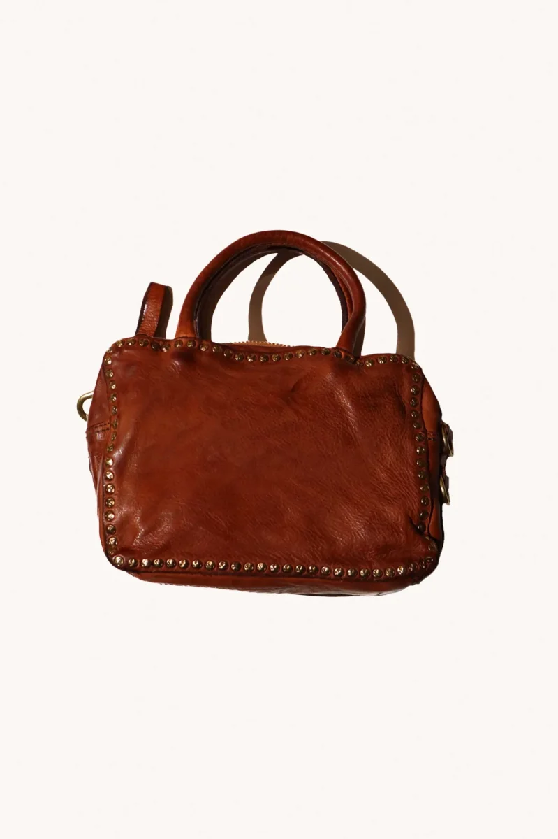 Le sac est équipé d’une bandoulière ajustable et amovible pour le porter en travers du corps ou à l’épaule, ainsi que d’une anse courte pour le porter à la main selon les envies. Les détails métalliques et les rivets apportent une touche vintage et raffinée, et le logo Campomaggi discret souligne la signature de la marque sans être ostentatoire.