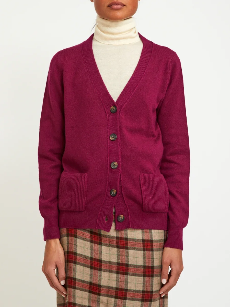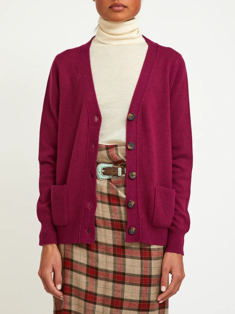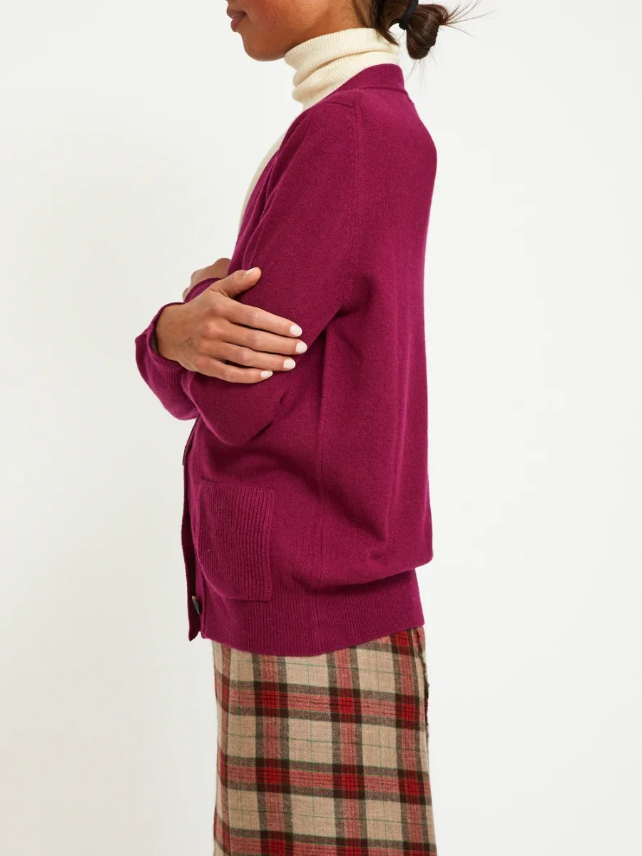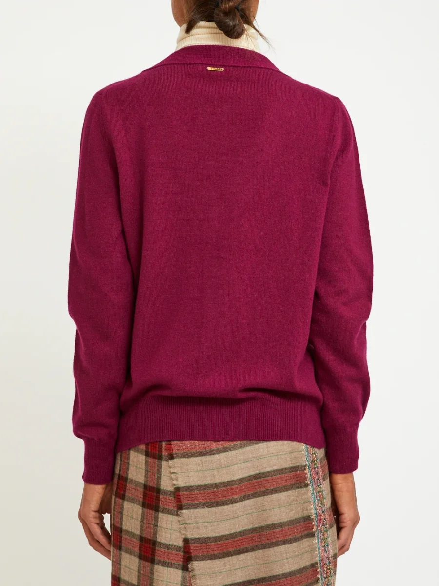 Cardigan William BY MARIE Collection. Ce cardigan en 100% cachemire coloris violine est sublimé par des jeux de tricotages. Ce pull manche longue se ferme par des boutons imitation corne. Le modèle existe en plusieurs coloris.