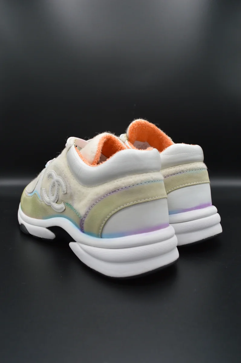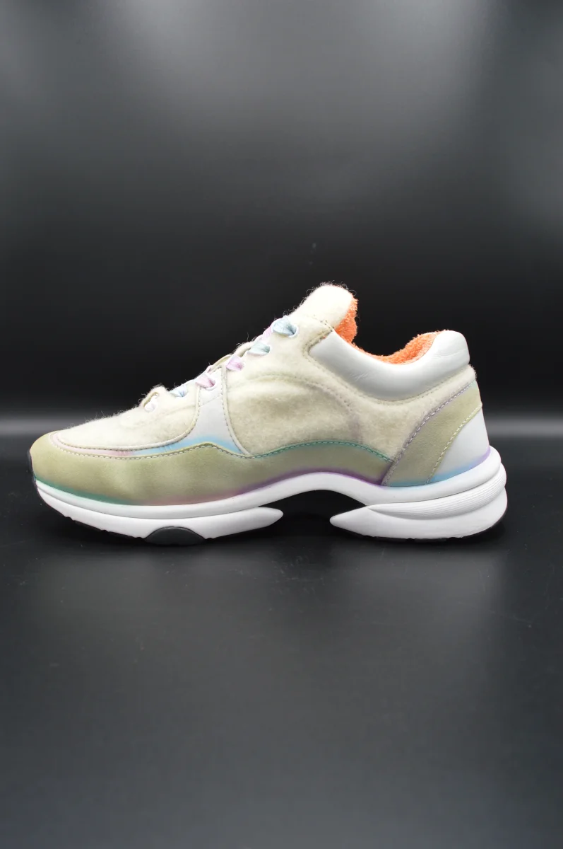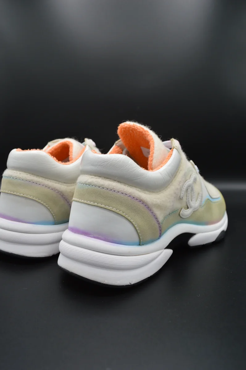 Détails de l’article : Marque : Chanel Modèle : Sneaker basse Pointure : 38 Etat : Très bon état Couleur : Blanc/multicolore Matière : Cuir/ daim/molletonné Accessoires inclus : Boite/dustbag/facture et étiquette