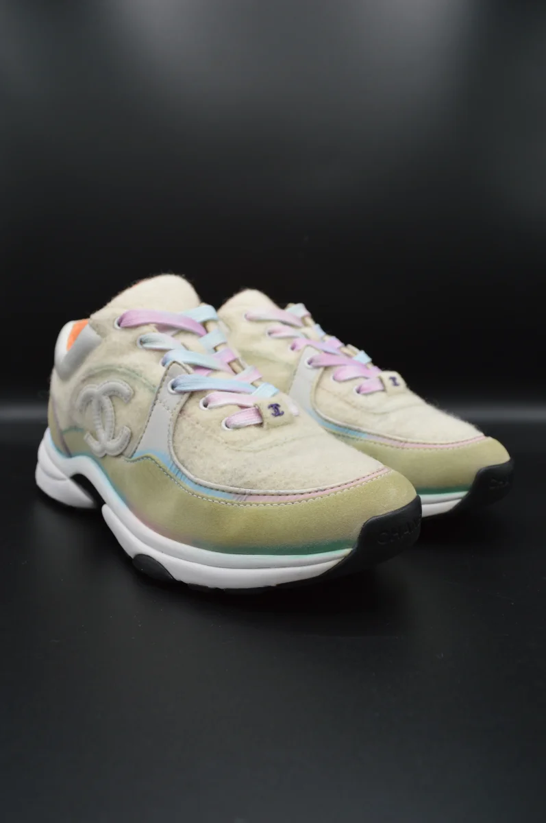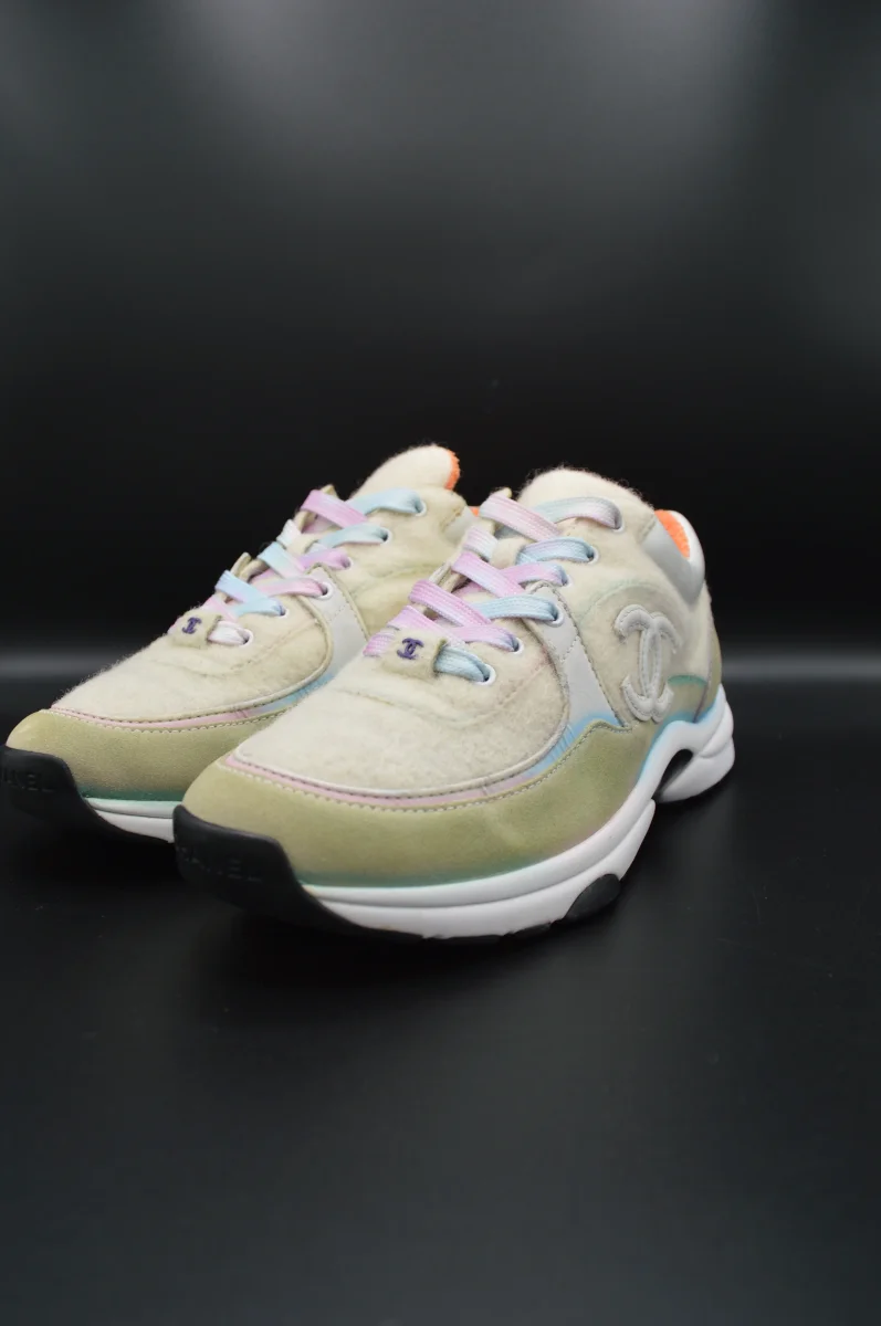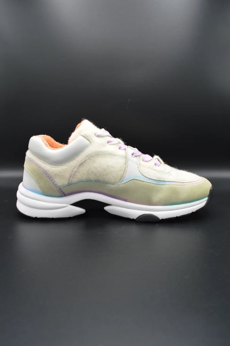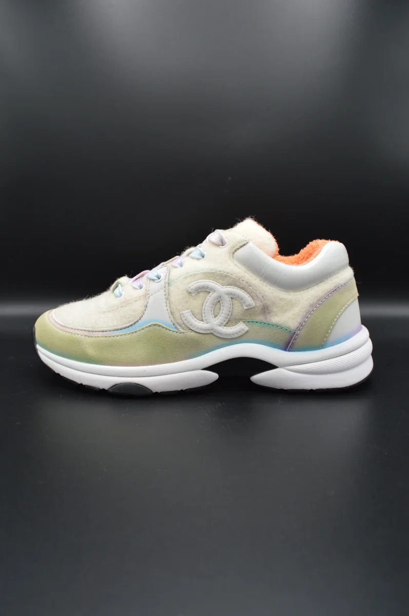 Détails de l’article : Marque : Chanel Modèle : Sneaker basse Pointure : 38 Etat : Très bon état Couleur : Blanc/multicolore Matière : Cuir/ daim/molletonné Accessoires inclus : Boite/dustbag/facture et étiquette
