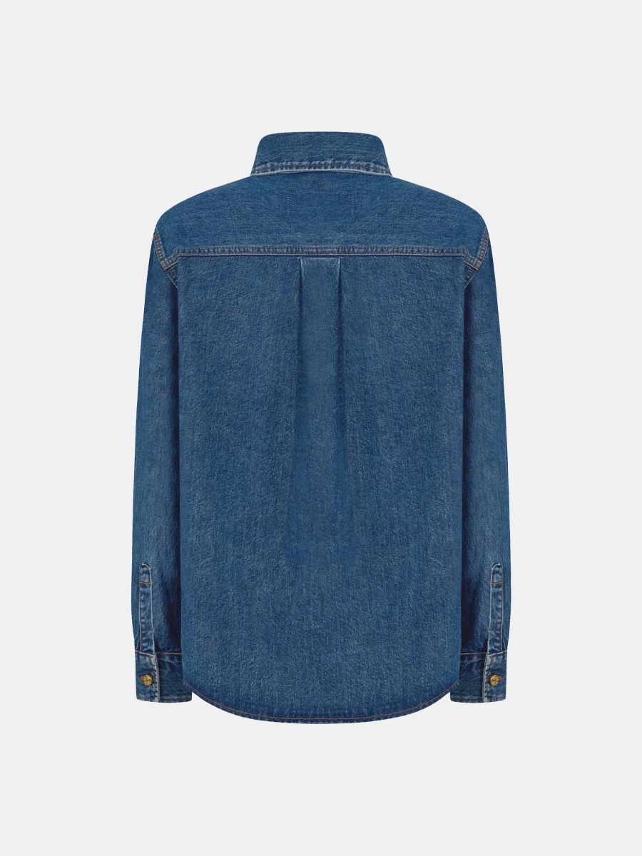 Chemise Berber Nariida Sapphire signée Blazé Milano confectionnée en toile de jean bleu brut. Une chemise à la coupe droite accompagnée de deux poches plaquées sur la poitrine. – Fabriquée en Italie – Boutons dorés à l’effet tressé, signature de la marque – Broderie emblématique près de la poche