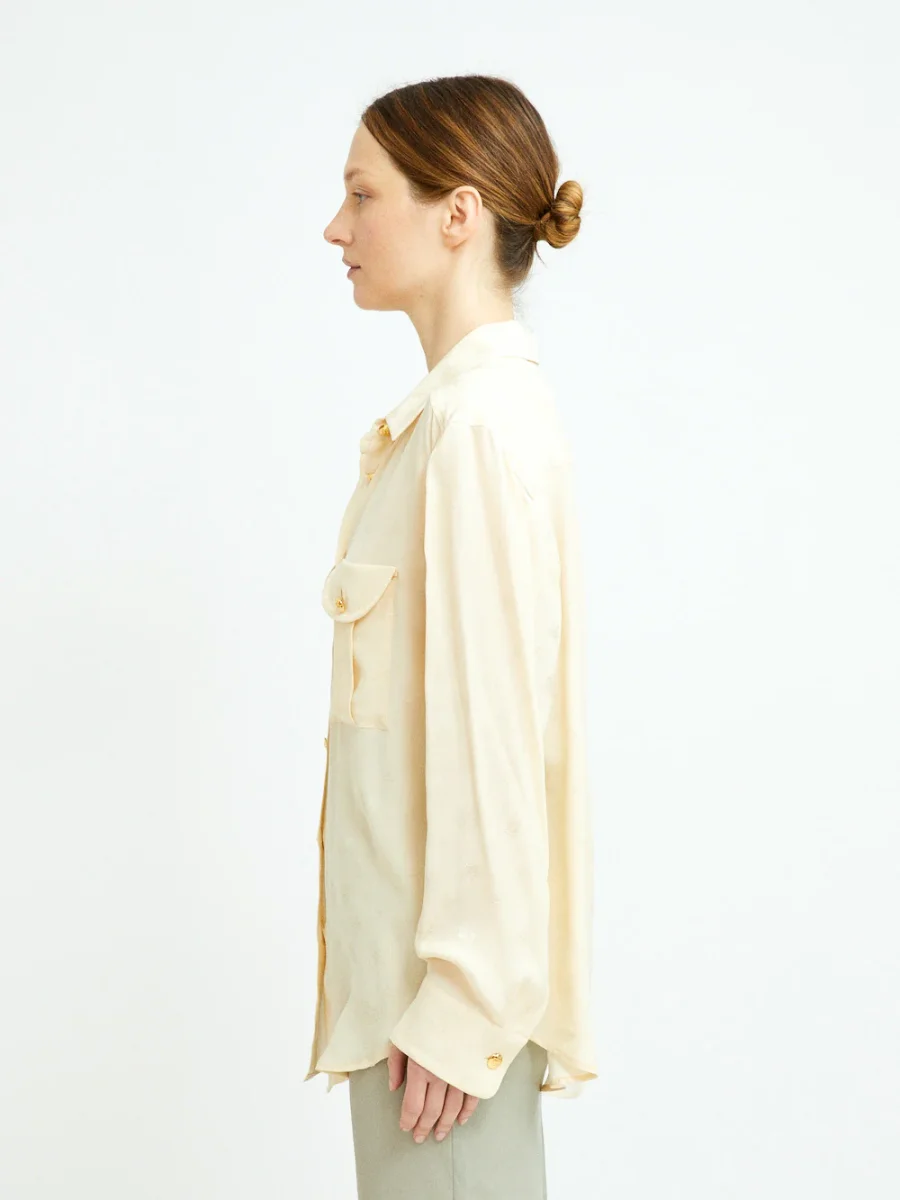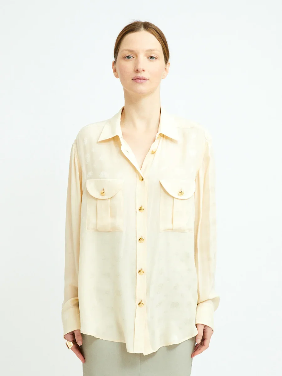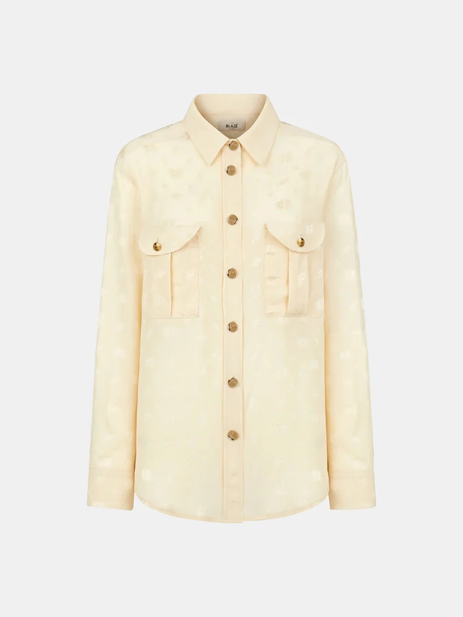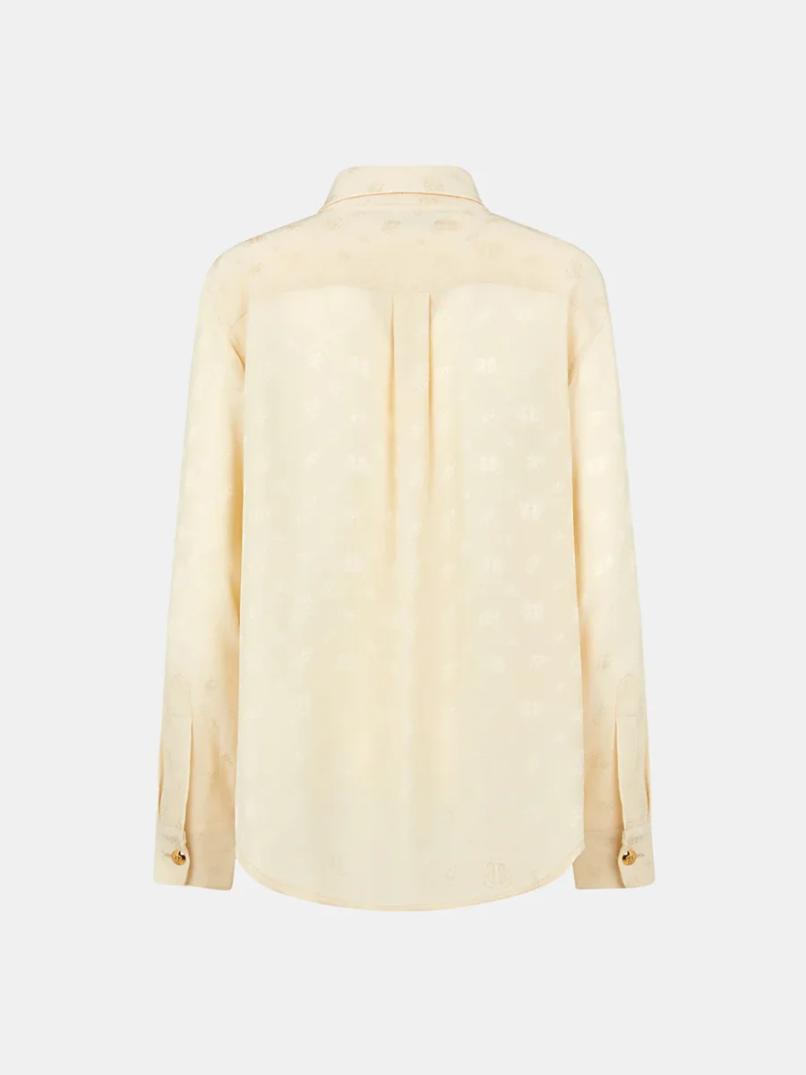 Cette chemise Berber Seahorses signée Blazé Milano. Elle est confectionnée en soie couleur beurre imprimée ton-sur-ton de hippocampes, signature de la marque. – Boutons en métal doré en relief – Coupe ample et fluide – Deux poches plaquées sur le devant – Fabriquée en Italie