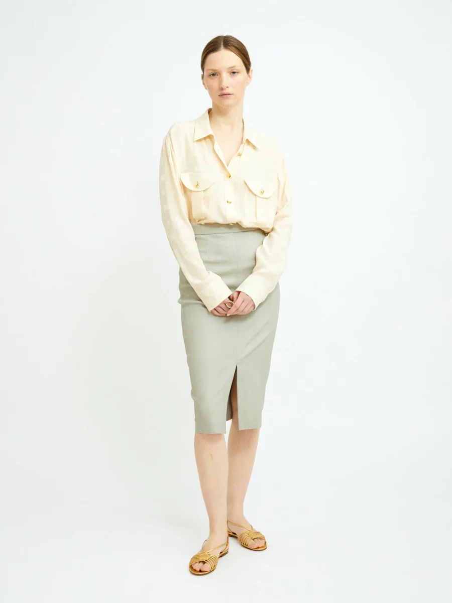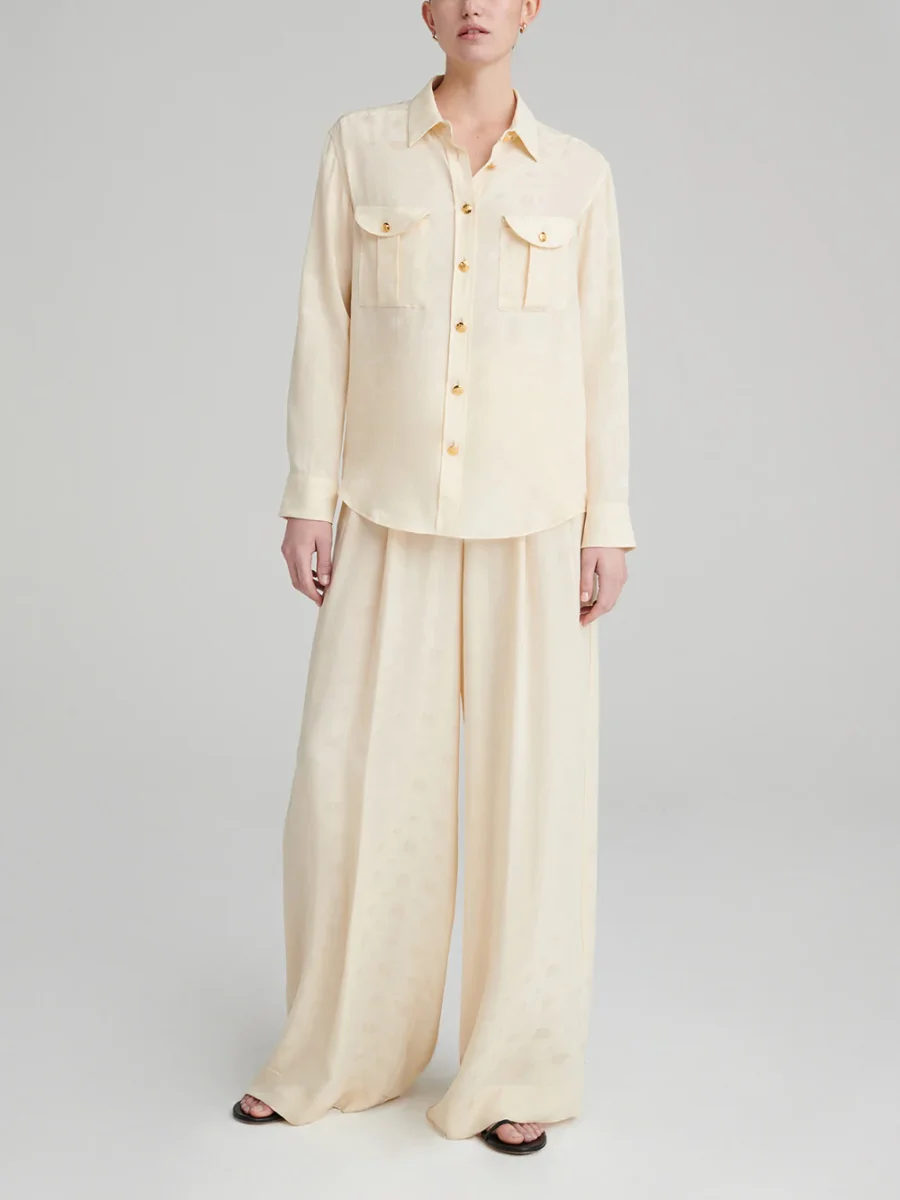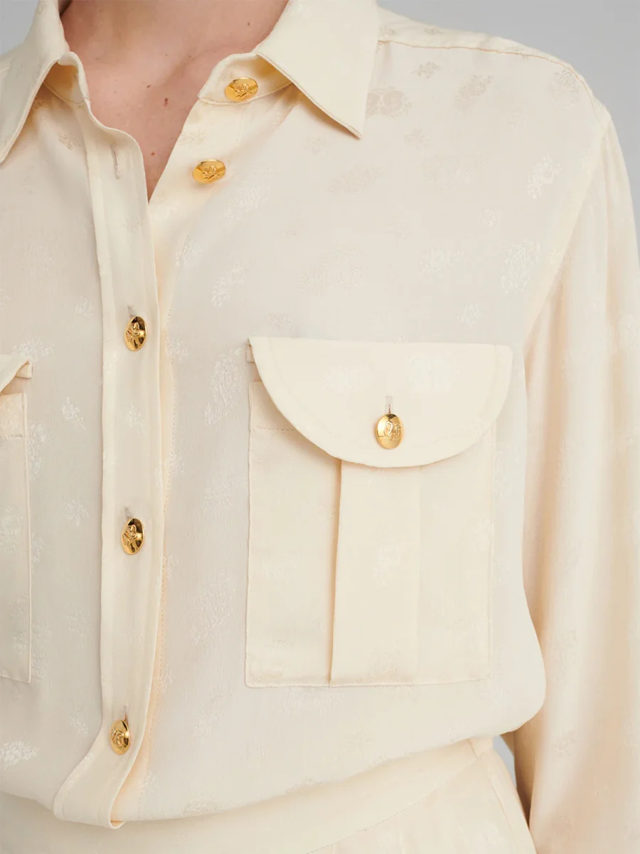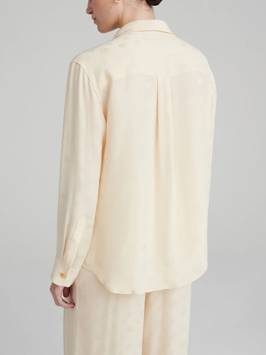 Cette chemise Berber Seahorses signée Blazé Milano. Elle est confectionnée en soie couleur beurre imprimée ton-sur-ton de hippocampes, signature de la marque. – Boutons en métal doré en relief – Coupe ample et fluide – Deux poches plaquées sur le devant – Fabriquée en Italie