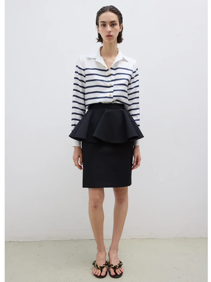 Chemise Constance signée Françoise confectionnée en soie blanche aux rayures bleu marine. Une chemise à la coupe droite boutonnée sur le devant grâce à des boutons vintages issus de maisons de couture.