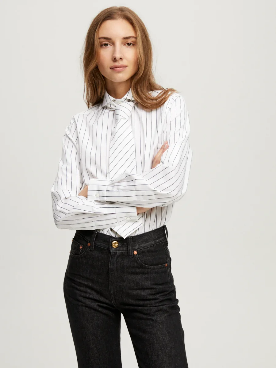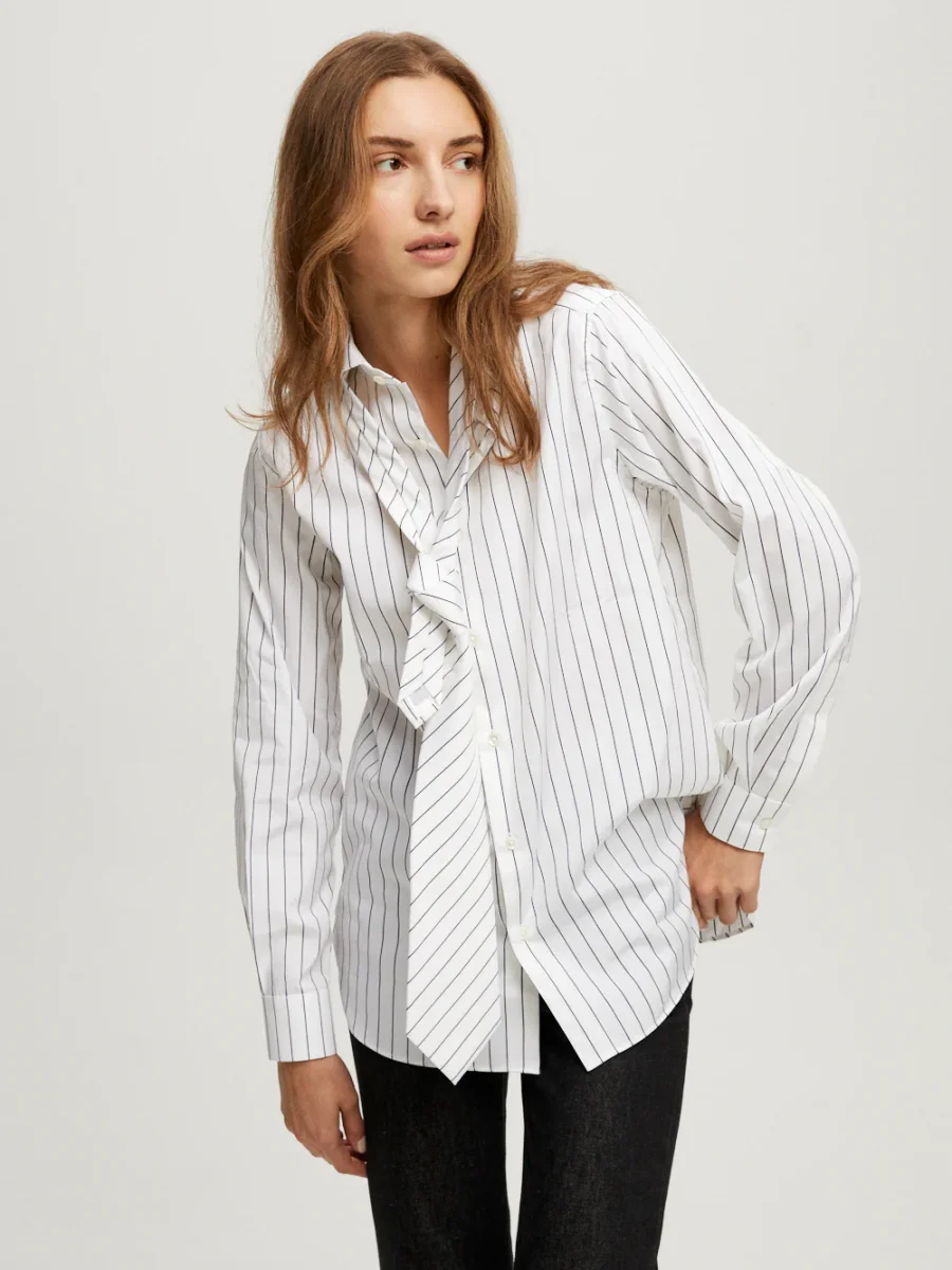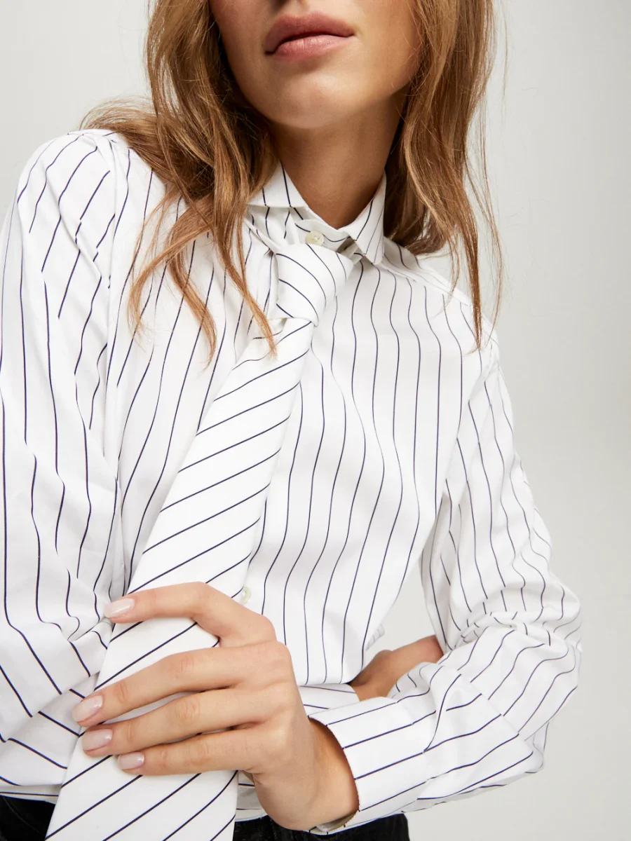 Chemise de Garçon Rayures Deauville signée Sébline confectionnée en coton blanc aux rayures fines bleu marine. Une chemise à la coupe droite accompagnée d’une cravate amovible assortie.