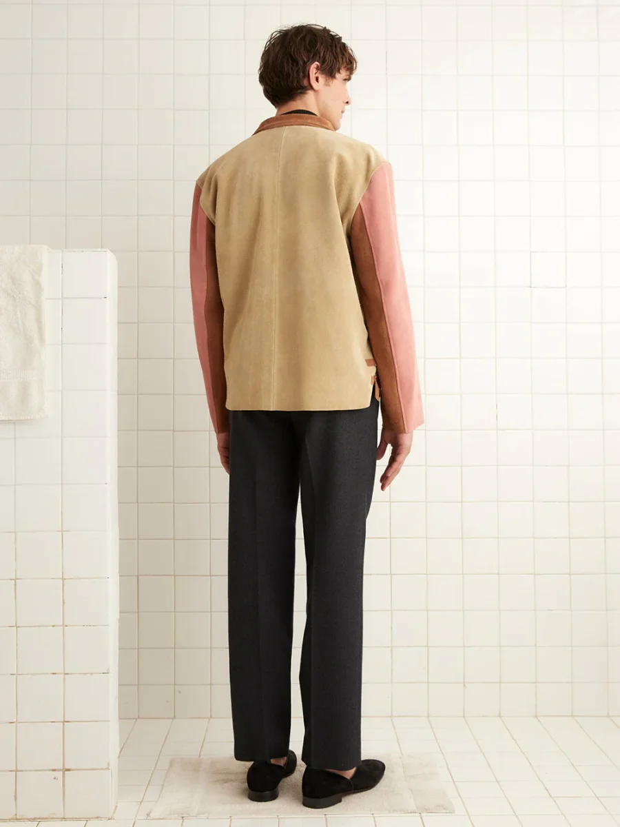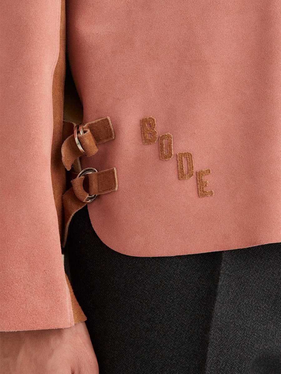 Chemise de Travail signé Bode confectionnée en cuir suede rose poudré et beige. Une coupe inspiré des blouse de travail des années 1960-1970. – 100% Cuir – Fabriqué en Inde – Boucles en cuir sur les côté – Deux poches en cuir beige plaquées sur la poitrine – Fermeture boutonnée sur le devant