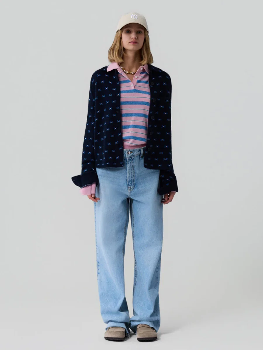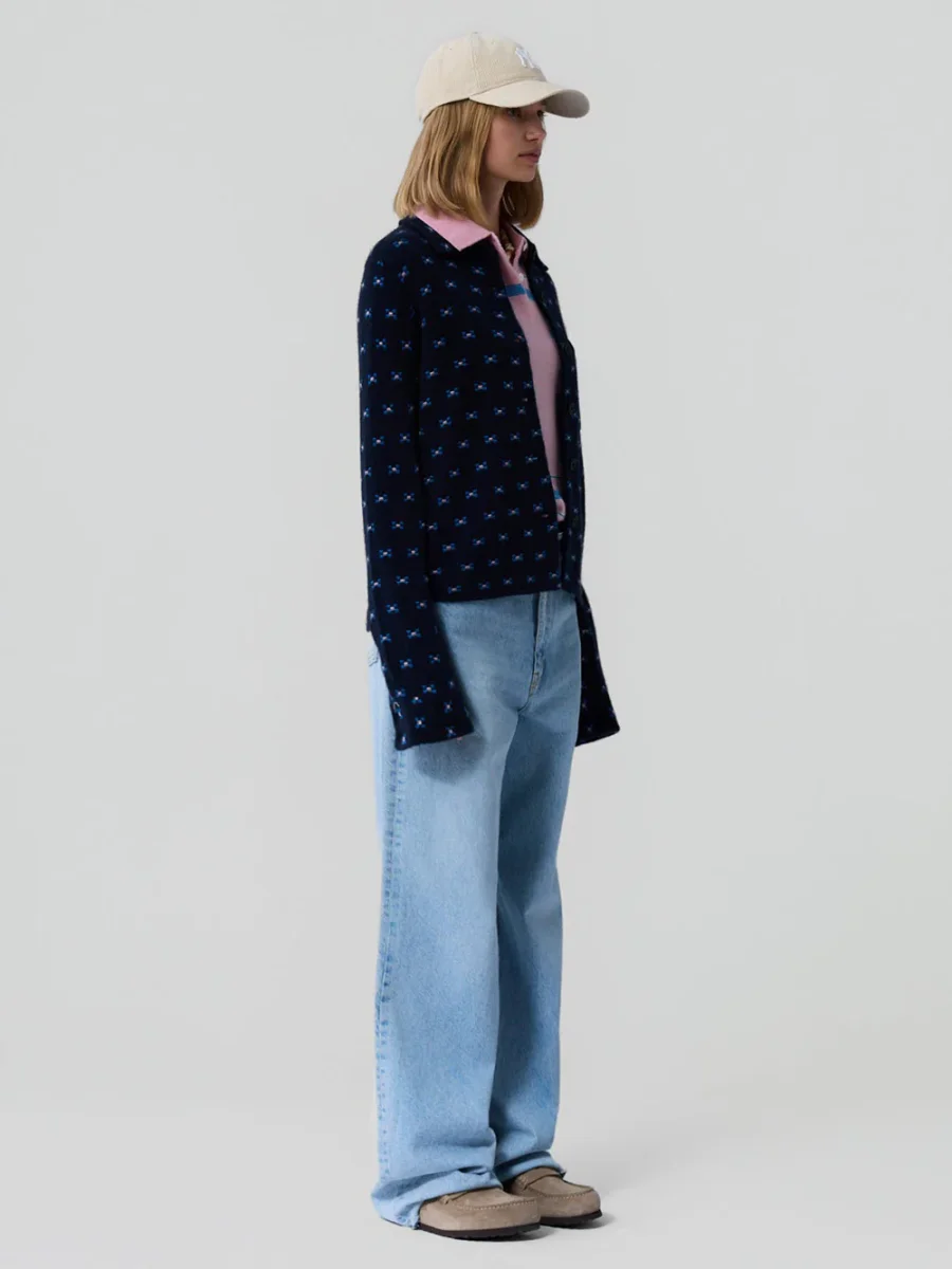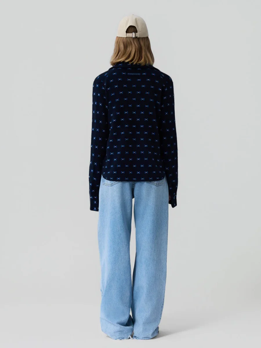Chemise Dylan Tweed signé Guest In Residence confectionné en cachemire bleu nuit décoré de petits motifs géométriques bleu. Une chemise à la coupe droite boutonnée sur le devant. – Cachemire de Mongolie – Le mannequin mesure 1m75 et porte une taille S