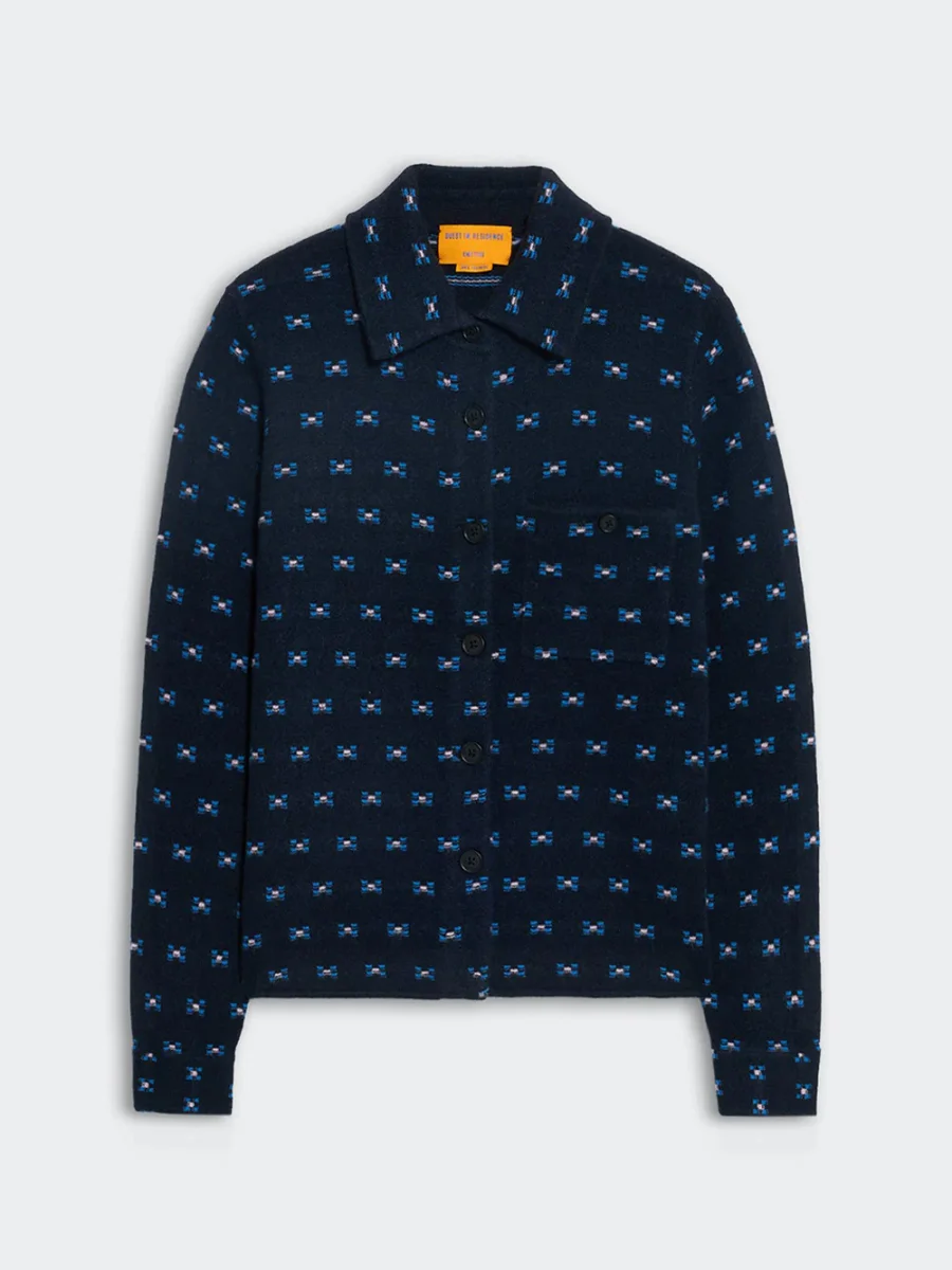 Chemise Dylan Tweed signé Guest In Residence confectionné en cachemire bleu nuit décoré de petits motifs géométriques bleu. Une chemise à la coupe droite boutonnée sur le devant.