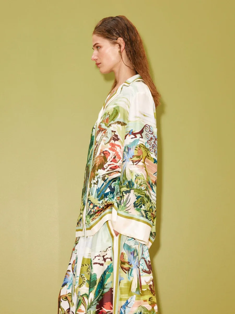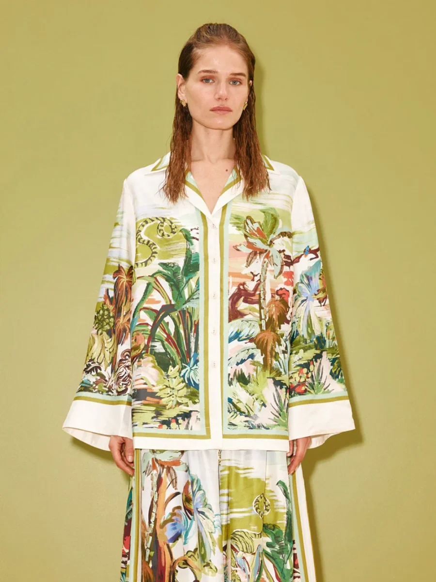 Chemise Jungle Boogie signée Alémais confectionnée en soie imprimée d’un paysage représentant la savane avec tigres, léopards, palmiers et perroquets. Une chemise inspirée des coupes pyjama avec des manches longues et large et une fermeture boutonnée sur le devant. – Coupe large – Le mannequin mesure 1m75 et porte une taille 6