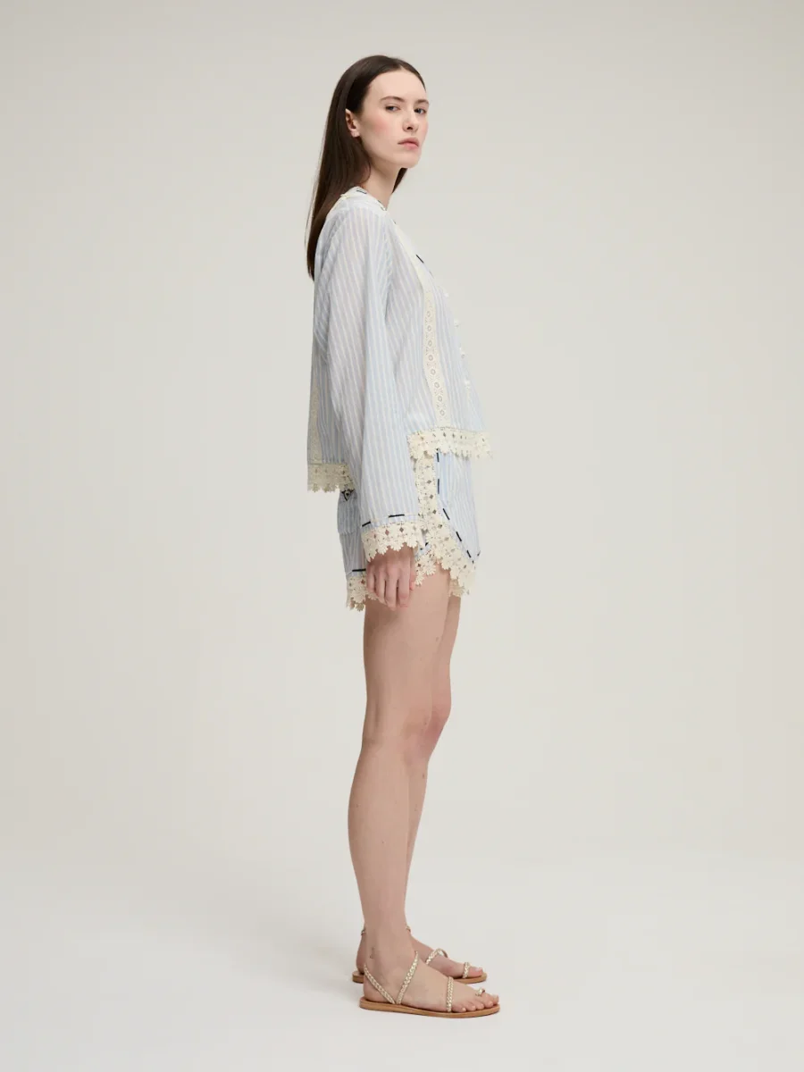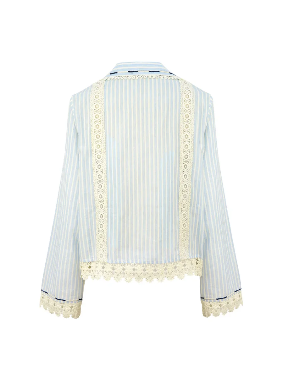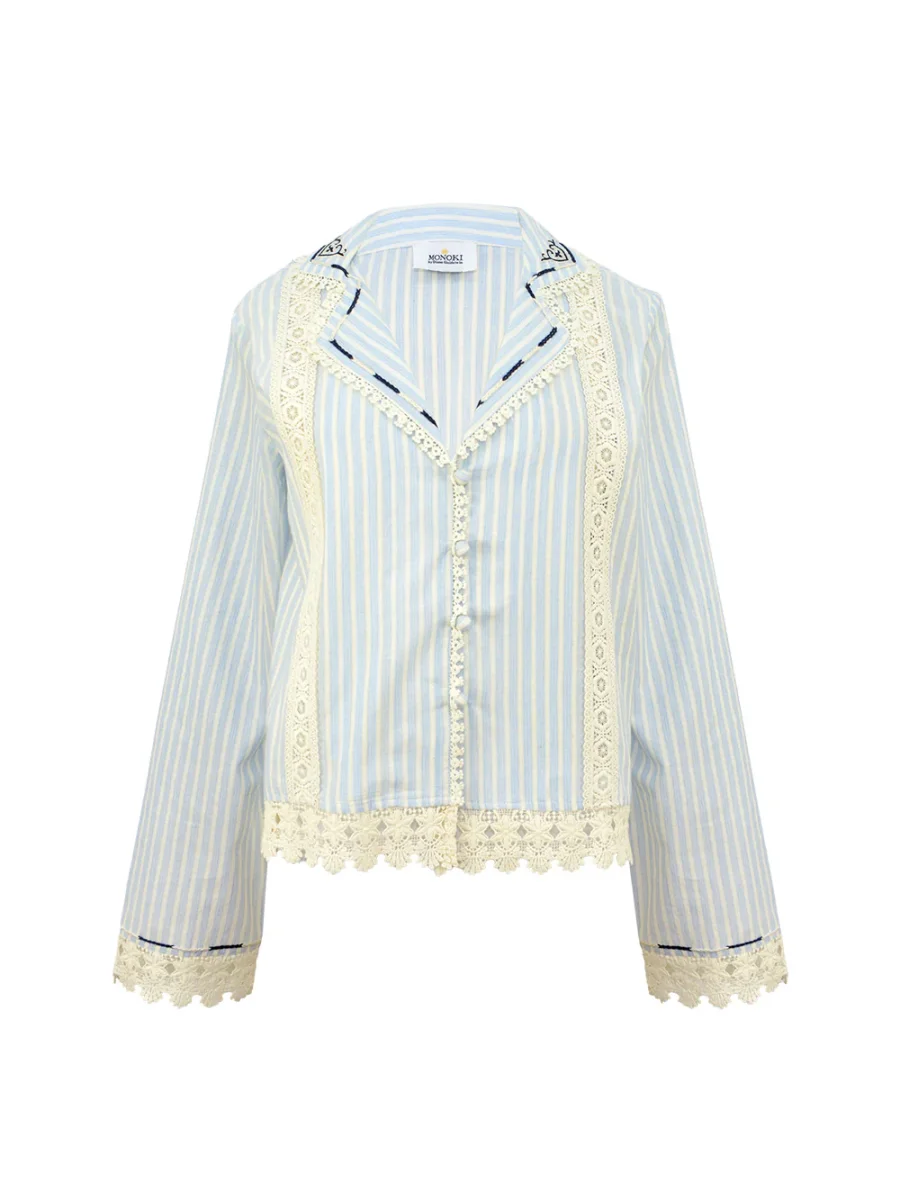 Chemise Gloria signée Monoki confectionnée en coton bleu ciel aux rayures blanches, le tout décoré de dentelle ajourée. Une chemise à la coupe droite et aux manches longues évasée.