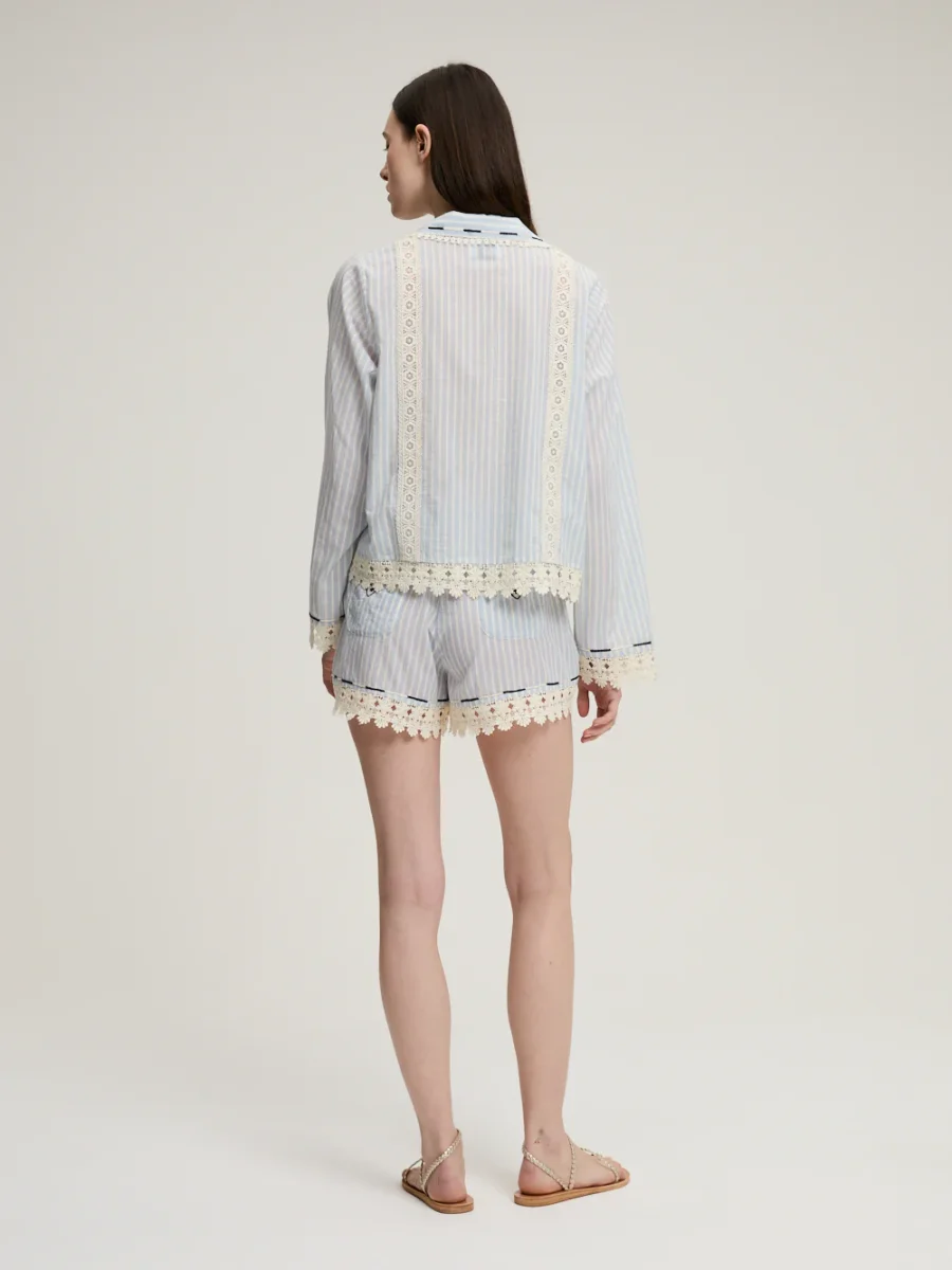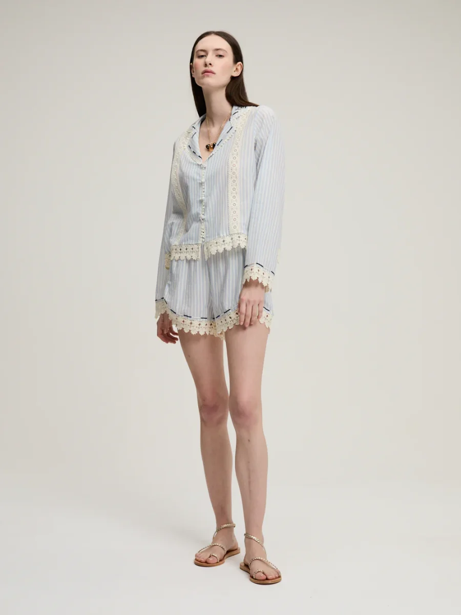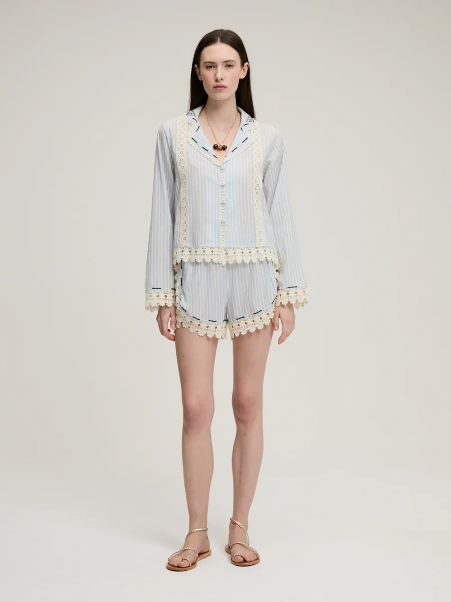Chemise Gloria signée Monoki confectionnée en coton bleu ciel aux rayures blanches, le tout décoré de dentelle ajourée. Une chemise à la coupe droite et aux manches longues évasée.