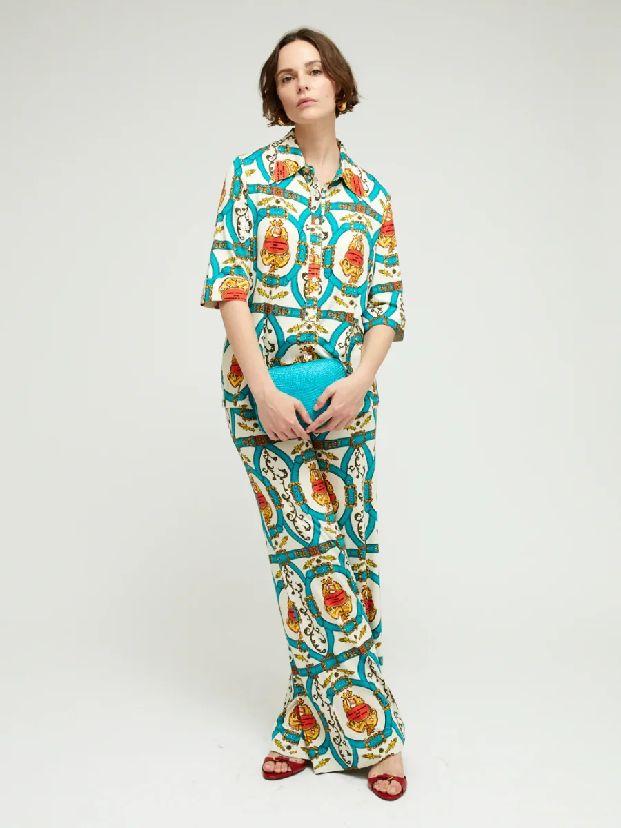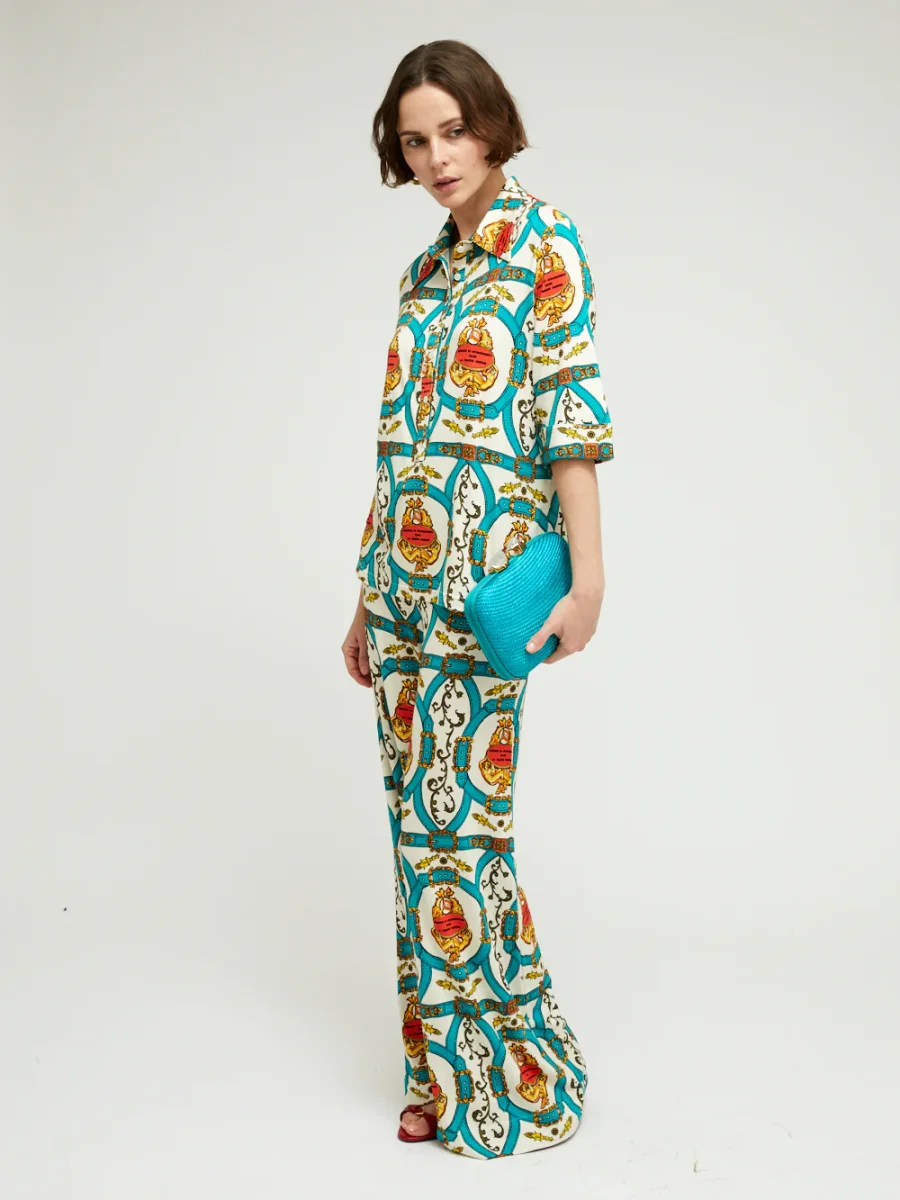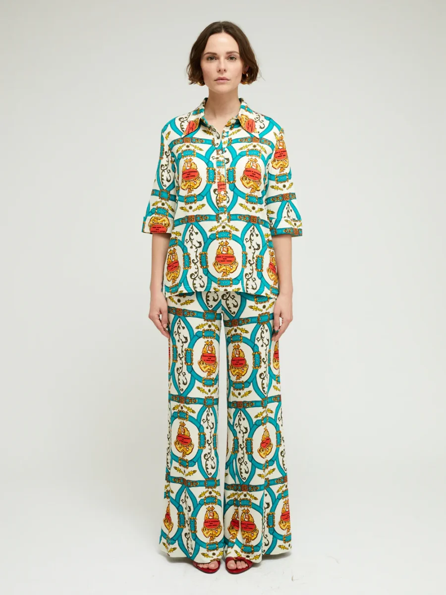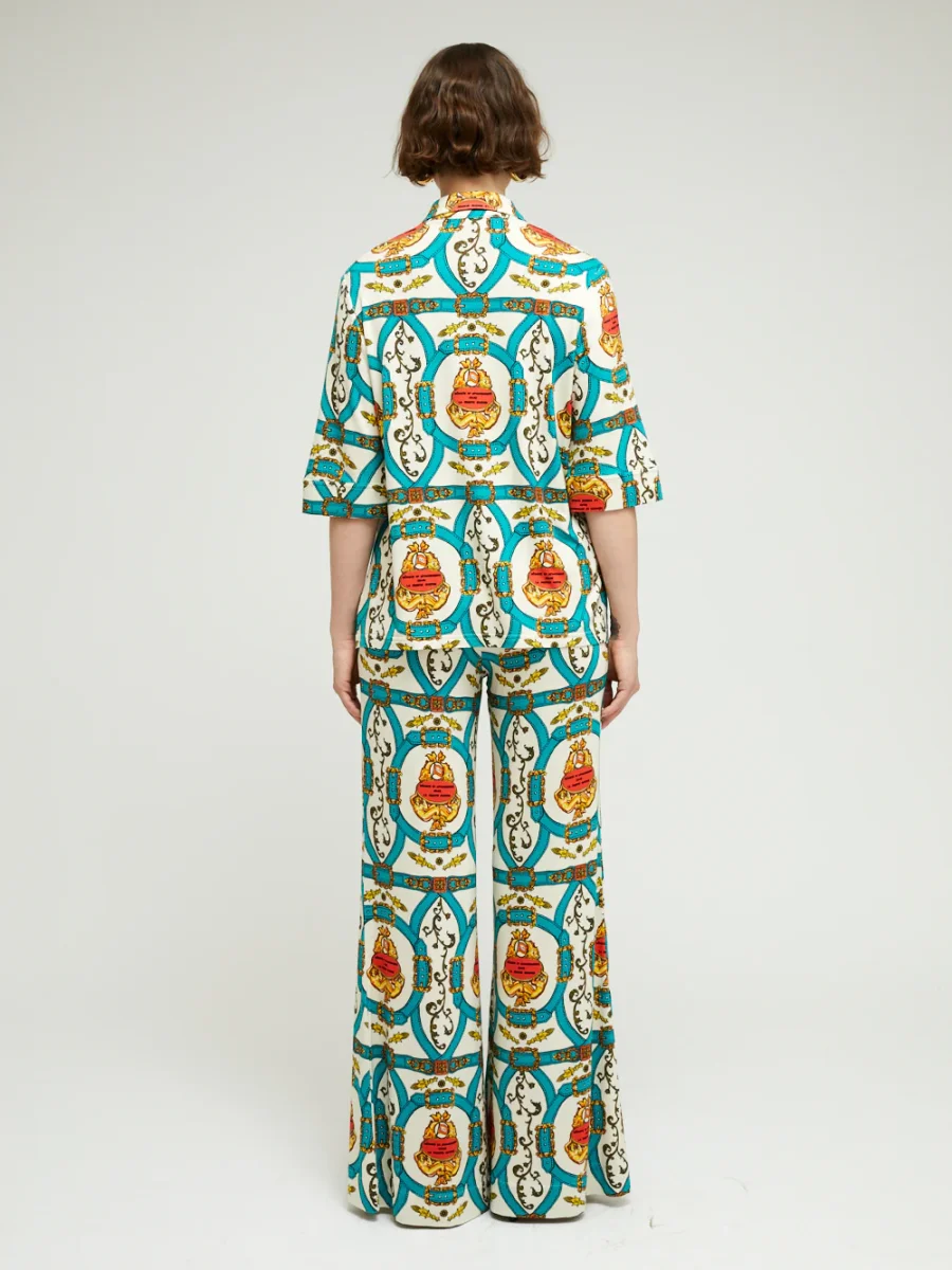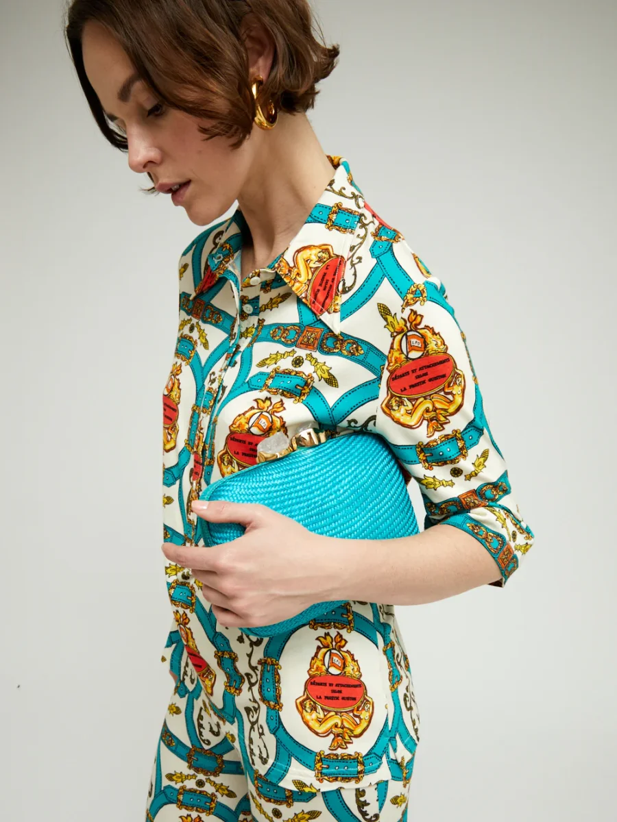 Chemise Lauren Bride Canard signée La Prestic Ouiston confectionnée en jersey de viscose imprimé de motifs rococo. Coupe de style polo à manches mi-longues. – Col pointu – Fermeture à boutons sur le devant – Fabriqué en Italie – Le mannequin mesure 1m70 et porte ici une taille 1
