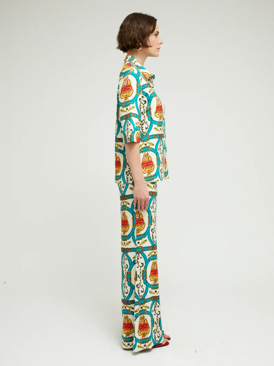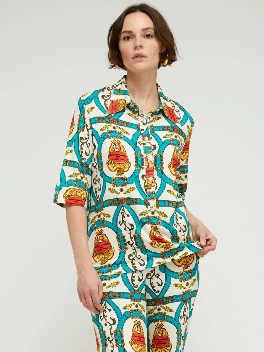 Chemise Lauren Bride Canard signée La Prestic Ouiston confectionnée en jersey de viscose imprimé de motifs rococo. Coupe de style polo à manches mi-longues.