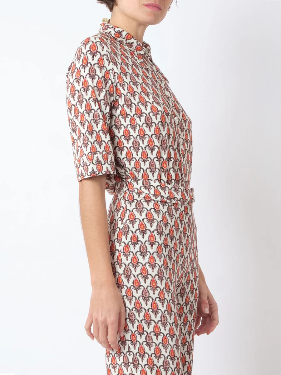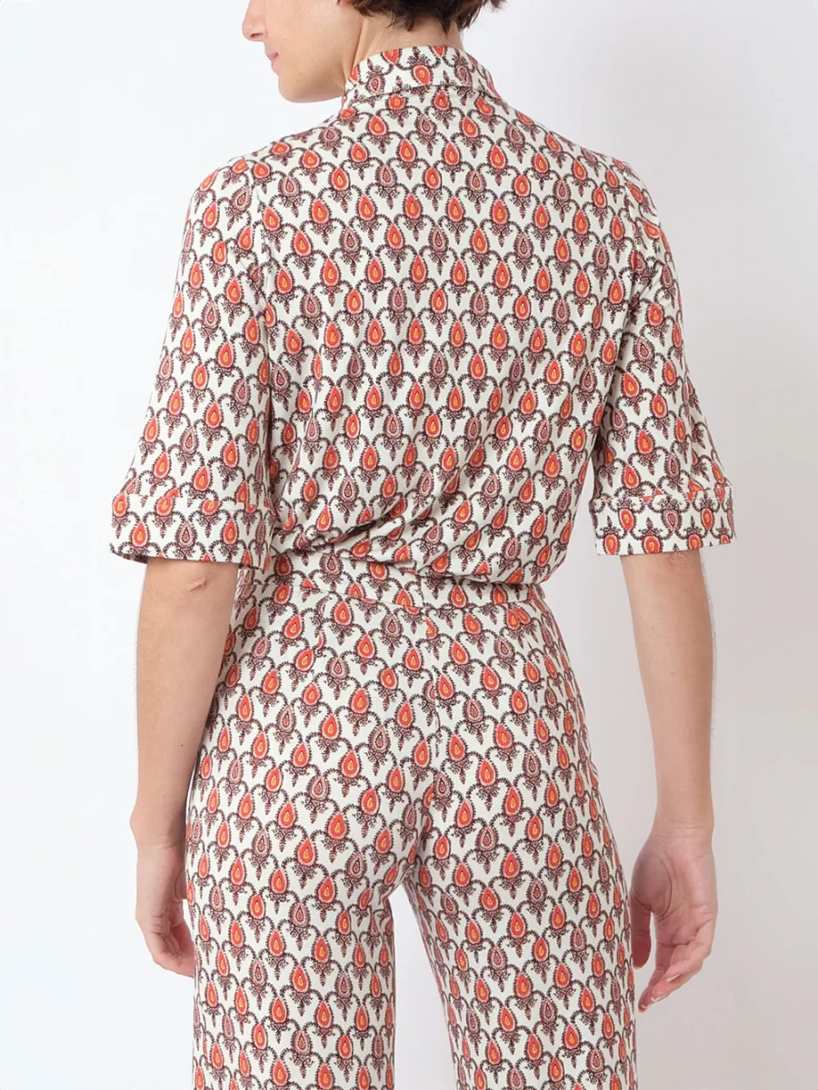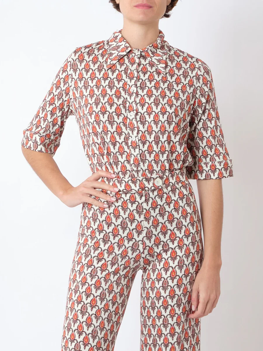 Chemise Lauren Soleil Rouge signée La Prestic Ouiston confectionnée en jersey de viscose imprimé de motifs géométrique. Coupe de style polo à manches mi-longues. – Col pointu – Fermeture à boutons sur le devant – Imprimé dans les tons jaune, rouge et marron – Fabriqué en Italie