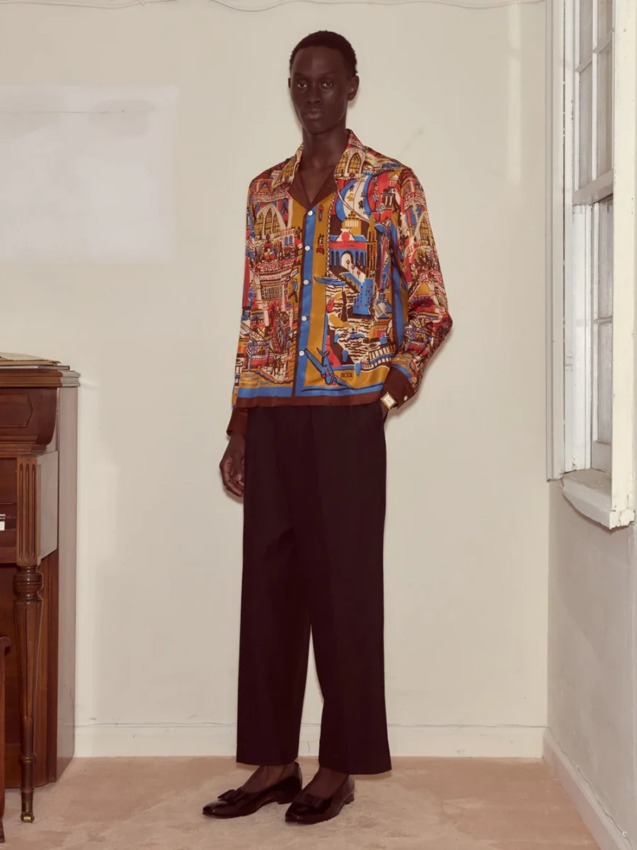 Chemise Manhattan Island signée Bode confectionnée en soie dans les tons orange, marron, rouge et bleu, représentant le Manhattan des années 1950 de Moose Charlap. Un imprimé mettant en lumière Grand Central Terminal, The New York Stock Exchange, Battery Park et le Met. – Fabriquée en Inde – Le mannequin mesure 1m85 et porte une […]