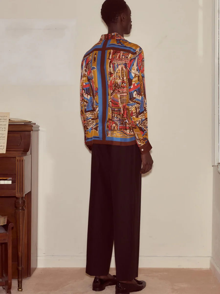 Chemise Manhattan Island signée Bode confectionnée en soie dans les tons orange, marron, rouge et bleu, représentant le Manhattan des années 1950 de Moose Charlap. Un imprimé mettant en lumière Grand Central Terminal, The New York Stock Exchange, Battery Park et le Met.