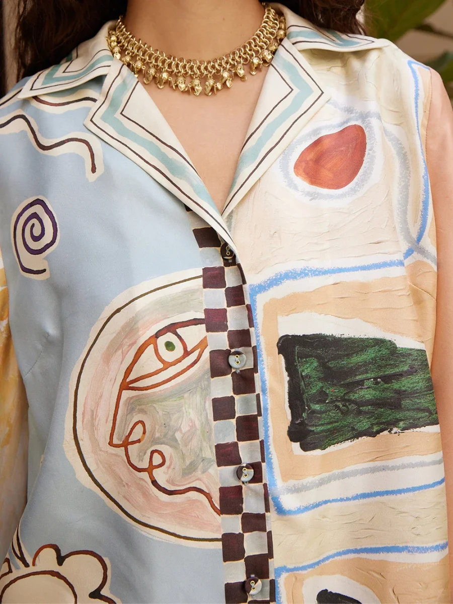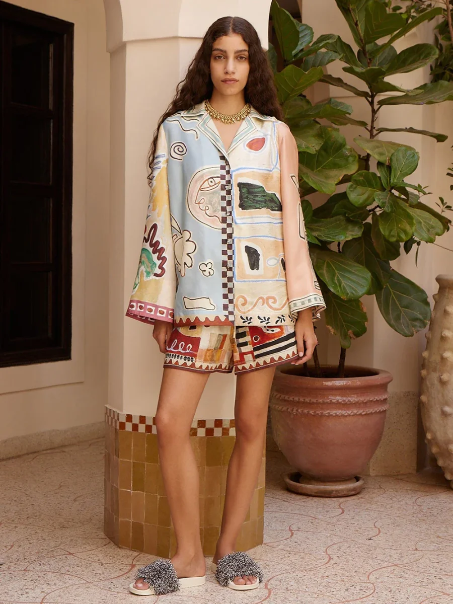 Chemise Michelle signée Alémais confectionnée en soie imprimée de motifs géométrique dessinés par l’artiste Laurence Leenaert dans les tons rose poudré, bleu ciel et jaune beurre.