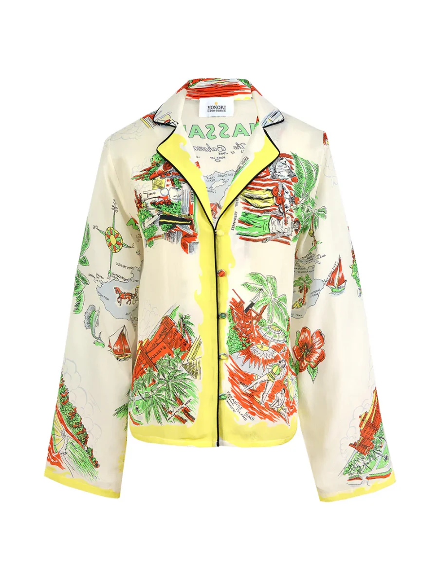 Chemise Nassau signée Monoki confectionnée en soie de couleur crème imprimé de paysage de Nassau, capitale des Bahamas, dans les tons jaune, rouge et vert. Une chemise à la coupe inspirée des pyjamas. – Taille Unique – Bordures noires contrastantes