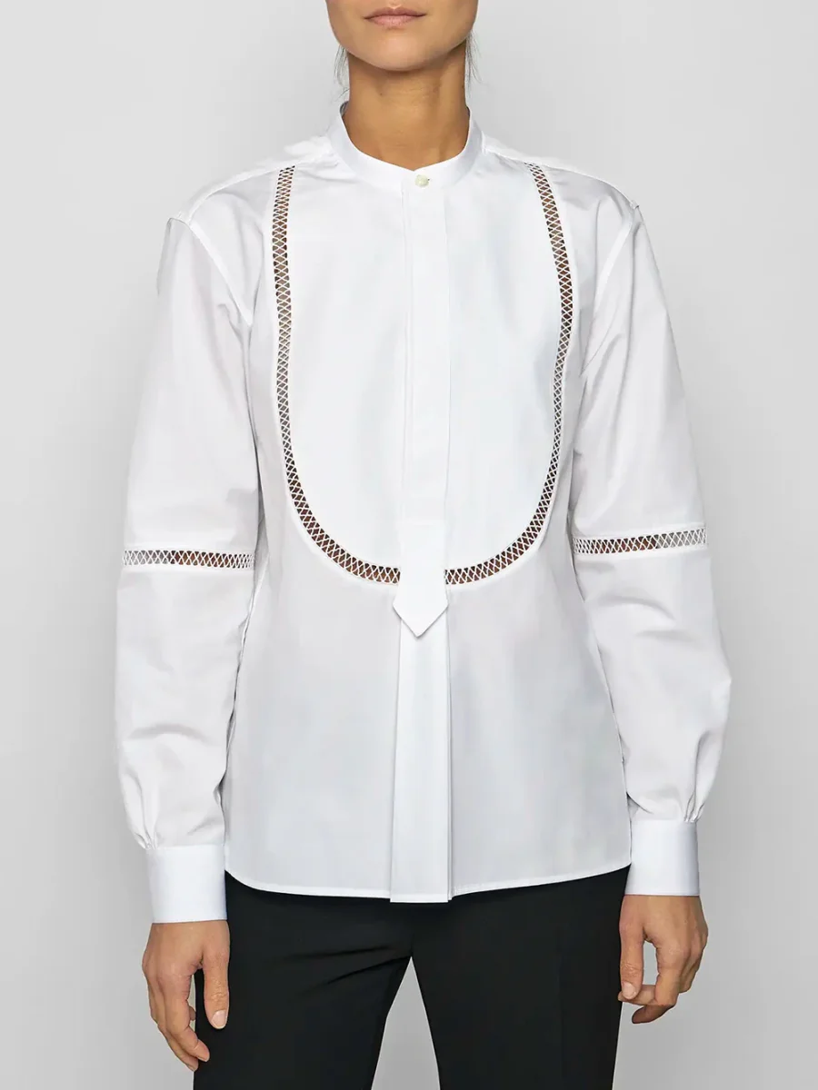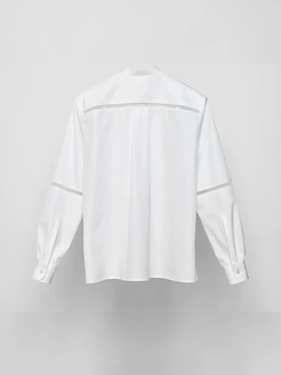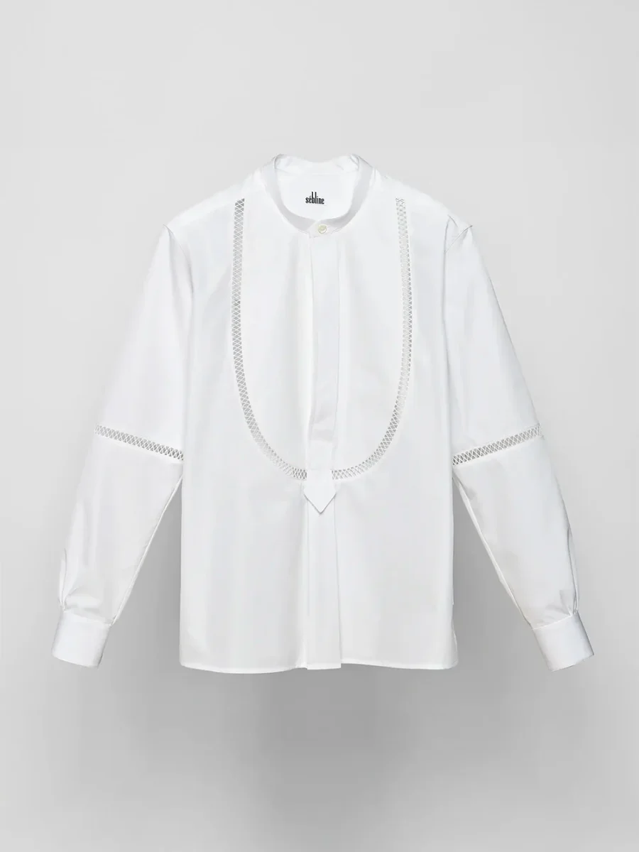 Chemise Painter Ajourée signée Sébline confectionnée en popeline de coton italienne blanche décorée de coutures ajourées. Une chemise à la coupe inspirée des blouses de peintre.